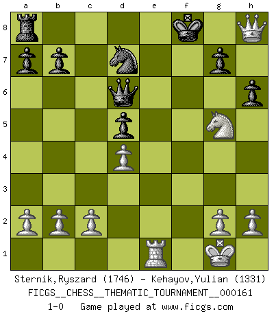 Last move : 1-0 2013 April 15 20:54:0 [Event "FICGS__CHESS__THEMATIC_TOURNAMENT__000161"] [Site "FICGS"] [Date "2013.03.28"] [Round "1"] [White "Sternik,Ryszard"] [Black "Kehayov,Yulian"] [Result "1-0"] [WhiteElo "1746"] [BlackElo "1331"] 1.e4 e5 2.f4 exf4 3.Nf3 d6 4.d4 Nf6 5.Nc3 Be7 6.Bxf4 O-O 7.Bc4 h6 8.O-O c6 9.e5 dxe5 10.Nxe5 Be6 11.Bxe6 fxe6 12.Qd3 Bd6 13.Ng6 Rf7 14.Rae1 Bxf4 15.Nxf4 Nd5 16.Nxe6 Qd6 17.Rxf7 Kxf7 18.Nxd5 cxd5 19.Qf5+ Kg8 20.Ng5 Nd7 21.Qh7+ Kf8 22.Qh8+ 1-0 KGA : Fischer defense Kingside Castling by player Black (move 6) Kingside Castling by player White (move 8) Player White won this chess game. Follow this game move after move (download)Daring ideas are like Chess men moved forward. They may be beaten, but they may start a winning game. (Johann Wolfgang von Goethe) Die Auseinandersetzung mit Karpow war politisch geprägt. Er stand für das kommunistische System, wurde von dessen Repräsentanten gehätschelt. Ich war der Oppositionelle. Jeder Schachweltmeister spiegelt auch die gesellschaftlichen Verhältnisse wider. Kramnik steht für die Börsen-Generation des Neuen Markts, ideologiefrei, zahlenfixiert. (Garry Kasparov) El jugador táctico debe saber que hacer cuando algo se debe de hacer. El estratégico debe saber que hacer cuando nada se debe de hacer. (Savielly Tartakover) Soyez une menace à chaque fois que vous vous asseyez pour jouer. (Ken Smith) The leaves of memory seemed to make a mournful rustling in the dark. (Henry Wadsworth Longfellow)