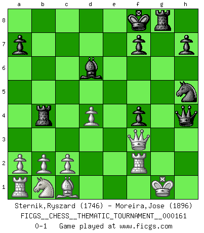 Last move : 0-1 2013 April 11 18:54:11 [Event "FICGS__CHESS__THEMATIC_TOURNAMENT__000161"] [Site "FICGS"] [Date "2013.03.28"] [Round "1"] [White "Sternik,Ryszard"] [Black "Moreira,Jose"] [Result "0-1"] [WhiteElo "1746"] [BlackElo "1896"] 1.e4 e5 2.f4 exf4 3.Nf3 g5 4.h4 g4 5.Ne5 Nf6 6.Bc4 d5 7.exd5 Bd6 8.d4 Nh5 9.Bb5+ c6 10.dxc6 bxc6 11.Nxc6 Qb6 12.Qe2+ Kf8 13.Qc4 Bb7 14.Nxb8 Rxb8 15.O-O Qd8 16.Ba4 Bxg2 17.Rf2 Rb4 18.Qc3 Bf3 19.Bc6 Qxh4 20.Bxf3 gxf3 21.Qxf3 Rg8+ 0-1 KGA : Kieseritsky, Berlin defense, 6.Bc4 Kingside Castling by player White (move 15) Player Black won this chess game. Follow this game move after move (download)An attack on the wing should be met by play in the center. (Nimzovitch) Ivan Sokolov treibt mich als Beifahrer an mit go Loeky go - . (Loek van Wely) Los problemas de Ajedrez exigen del compositor las mismas virtudes que caracterizan todo el arte de valor: originalidad, invención, concisión, armonía, complejidad e insinceridad explendida. (Vladimir Nabokov) Les Echecs sont et restent toujours un combat, un combat intégral comme la boxe, la lutte ou un autre sport, et où il doit y avoir un vainqueur et un vaincu. (Joseph Emil Diemer) A good teacher is like a candle - it consumes itself to light the way for others. (Author unknown)