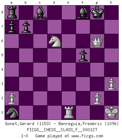 Last move : 1-0 2013 May 8 18:22:35 [Event "FICGS__CHESS__CLASS_F__000127"] [Site "FICGS"] [Date "2013.04.01"] [Round "1"] [White "Gonet,Gerard"] [Black "Benreguia,Frederic"] [Result "1-0"] [WhiteElo "1153"] [BlackElo "1096"] 1.d4 d5 2.e4 dxe4 3.Nc3 f5 4.f3 exf3 5.Nxf3 Nf6 6.Bd3 g6 7.Bg5 Ng4 8.h3 Nh6 9.O-O Bg7 10.Bc4 Nc6 11.d5 Nb4 12.Re1 Qd6 13.Qe2 O-O 14.Nb5 Qc5+ 15.Be3 Qxe3+ 16.Qxe3 Nxc2 17.d6 Nf7 18.Qxe7 cxd6 19.Nxd6 Nxa1 20.Bxf7+ Kh8 21.Ng5 Bxb2 22.Bxg6 Bd4+ 23.Kh1 Bg7 24.Ndf7+ Rxf7 25.Nxf7+ Kg8 26.Qe8+ Bf8 27.Nd6 hxg6 28.Qxg6+ 1-0 Blackmar gambit Kingside Castling by player White (move 9) Kingside Castling by player Black (move 13) Player White won this chess game. Follow this game move after move (download)Chess is no whit inferior to the violin, and we have a large number of professional violinists. (Mikhail Botvinnik) Schach verlangt totale Konzentration. (Robert James Fischer) Ayuda a tus piezas para que ellas te puedan ayudar. (Paul Morphy) Celui qui prend des risques peut perdre, celui qui n'en prend pas perd toujours. (Xavier Tartacover) The beginning is the most important part of the work. (Plato)