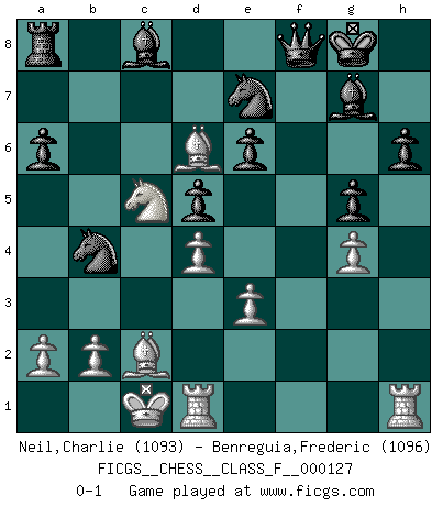 Last move : 0-1 2013 April 17 19:17:21 [Event "FICGS__CHESS__CLASS_F__000127"] [Site "FICGS"] [Date "2013.04.01"] [Round "1"] [White "Neil,Charlie"] [Black "Benreguia,Frederic"] [Result "0-1"] [WhiteElo "1093"] [BlackElo "1096"] 1.Nf3 g6 2.c4 Bg7 3.d4 e6 4.Bf4 Ne7 5.Nc3 d6 6.e3 O-O 7.h3 c6 8.Bd3 f5 9.Qd2 h6 10.O-O-O g5 11.Bh2 a6 12.g4 b5 13.cxb5 d5 14.bxc6 Nbxc6 15.Na4 fxg4 16.hxg4 Rxf3 17.Nc5 Qf8 18.Qc2 Rxf2 19.Bd6 Rxc2+ 20.Bxc2 Nb4 0-1 Reti Opening Kingside Castling by player Black (move 6) Queenside Castling by player White (move 10) Player Black won this chess game. Follow this game move after move (download)There is no remorse like the remorse of Chess. (H. G. Wells) Spielt Blackmar-Diemer-Gambit, und das Matt kommt von selbst! (Emil Joseph Diemer) Evita las multitudes. Haz independientemente tu propio razonamiento. Trata de ser el jugador de Ajedrez, no la pieza de Ajedrez. (Ralph Charell) Pour moi, les échecs ne sont pas un jeu mais un art. (Alexandre Alekhine) A married woman is like a fish riding a bicycle. (Rodolfo d'Ettorre)
