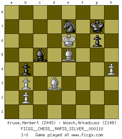 Last move : 1-0 2013 July 14 18:59:2 [Event "FICGS__CHESS__RAPID_SILVER__000110"] [Site "FICGS"] [Date "2013.04.01"] [Round "1"] [White "Kruse,Herbert"] [Black "Wosch,Arkadiusz"] [Result "1-0"] [WhiteElo "2445"] [BlackElo "2148"] 1.e4 c5 2.Nf3 d6 3.d4 cxd4 4.Nxd4 Nf6 5.Nc3 a6 6.Be3 e5 7.Nb3 Be6 8.f3 Be7 9.Qd2 O-O 10.O-O-O Nbd7 11.g4 b5 12.g5 b4 13.Ne2 Ne8 14.f4 a5 15.f5 a4 16.fxe6 axb3 17.cxb3 fxe6 18.Bh3 Rxa2 19.Bxe6+ Kh8 20.Ng3 Nc7 21.Bc4 Qa8 22.Rhf1 Rxf1 23.Rxf1 Ra1+ 24.Kc2 Rxf1 25.Bxf1 d5 26.Qf2 Qc6+ 27.Kb1 d4 28.Bd2 g6 29.h4 Nb6 30.Qe1 Qd6 31.Nh1 Ne6 32.Nf2 Nf4 33.Ng4 Bf8 34.Qc1 d3 35.Nxe5 Qxe5 36.Bxf4 Qxe4 37.Qe3 Qxe3 38.Bxe3 Nd7 39.Bxd3 Bd6 40.Kc2 Kg7 41.Be2 Ne5 42.Kd2 Kf8 43.Bf2 Kf7 44.Bc4+ Kg7 45.Bd4 h5 46.gxh6+ Kxh6 47.Be2 Kh7 48.Ke3 Nc6 49.Bf6 Kg8 50.Bg5 Kf7 51.Bc4+ Kg7 52.Kd3 Bc5 53.Ke4 Ne7 54.Ke5 Nf5 55.Bd3 Ne3 56.Ke6 Ng4 57.Bd8 Bf2 58.Be2 Nh6 59.Bf6+ Kh7 60.Bd3 Ng8 61.Bg5 Kg7 62.Bd2 Bc5 63.Bf4 Ne7 64.Be5+ 1-0 Sicilian : Najdorf, Byrne (English) attack Kingside Castling by player Black (move 9) Queenside Castling by player White (move 10) Player White won this chess game. Follow this game move after move (download)Who is your opponent tonight, tonight I am playing against the Black pieces. (Akiba Rubinstein) Der Partner hat auch seine Existenzberechtigung. (Savielly Grigorievitsch Tartakower) El Ajedrez es un juego de pelea el cual es puramente intelectual e incluye la suerte. (Richard Reti) Je menace de comprendre la position. (Anonyme) Excelling at chess has long been considered a symbol of more general intelligence. That is an incorrect assumption in my view, as pleasant as it might be. But for the purposes of argument and investigation, chess is, in Russkin-Gutman's words, 'an unparalleled laboratory, since both the learning process and the degree of ability obtained can be objectified and quantified, providing an excellent comparative framework on which to use rigorous analytical techniques.' (The Chess Master and the Computer, by Garry Kasparov - 2010)
