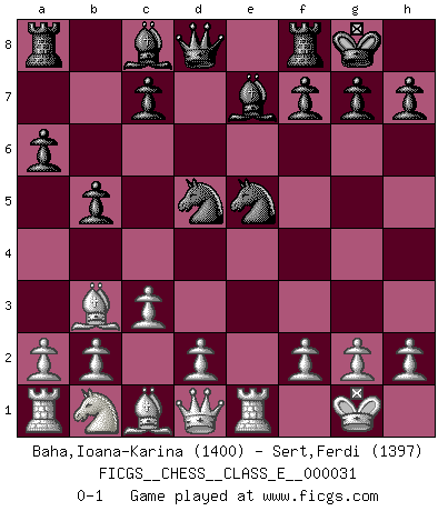 Last move : 0-1 2007 May 9 2:15:32 [Event "FICGS__CHESS__CLASS_E__000031"] [Site "FICGS"] [Date "2007.01.28"] [Round "1"] [White "Baha,Ioana-Karina"] [Black "Sert,Ferdi"] [Result "0-1"] [WhiteElo "1400"] [BlackElo "1397"] 1.e4 e5 2.Nf3 Nc6 3.Bb5 a6 4.Ba4 Nf6 5.O-O b5 6.Bb3 Be7 7.Re1 O-O 8.c3 d5 9.exd5 Nxd5 10.Nxe5 Nxe5 0-1 This chess game has been lost on time (started : 2007.01.28 15:4:48) Ruy Lopez : 5.O-O Kingside Castling by player White (move 5) Kingside Castling by player Black (move 7) Player Black won this chess game. Follow this game move after move (download)Tactics flow from a superior position. (Bobby Fischer) Es liegt in der Natur, vernüftig zu denken und unlogisch zu handeln. (Anatole France) Los Peones son nacidos libres, y aún así, se encuentran por doquier encadenados. (Rick Kennedy) Un millionnaire : 'Monsieur Steinitz ! Vous ne participez aux tournois que pour l'argent, alors que moi je n'y viens que pour l'honneur.' Steinitz : 'Chacun joue pour ce qu'il n'a pas'... If you are going through hell, keep going. (Winston Churchill)