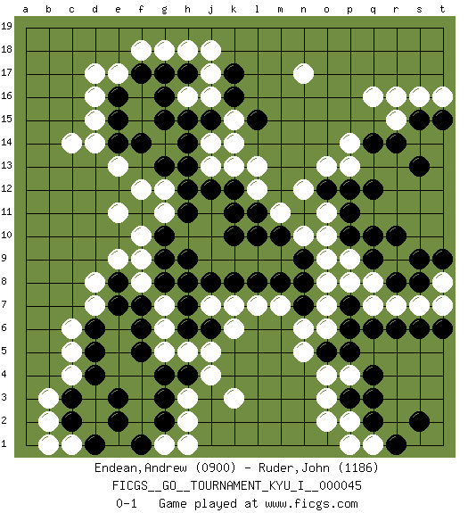 Last move : 0-1 2013 August 20 20:21:45 [Event "FICGS__GO__TOURNAMENT_KYU_I__000045"] [Site "FICGS"] [Date "2013.04.02"] [Round "1"] [Black "Endean,Andrew"] [White "Ruder,John"] [Result "0-1"] [Rating 1 "0900"] [Rating 2 "1186"] 1.q4 d16 2.d4 q16 3.q10 c6 4.d6 d7 5.d5 c5 6.e7 d8 7.e8 e9 8.f6 f9 9.k16 o3 10.p3 o4 11.q6 k3 12.r14 n17 13.f17 h16 14.h17 j17 15.g16 h18 16.g17 j16 17.f14 c14 18.g15 g18 19.h14 k15 20.k10 k13 21.h11 g12 22.h12 e11 23.g13 f12 24.h9 g7 25.h7 g6 26.f5 j5 27.h6 h5 28.g4 b3 29.c3 b2 30.c2 g5 31.g3 q8 32.r8 r9 33.q9 r7 34.s8 q7 35.p6 n6 36.r6 s7 37.s9 o7 38.o5 n5 39.s6 t7 40.t6 o9 41.p11 p13 42.q12 n12 43.m10 n10 44.m8 m11 45.l10 d17 46.e16 f18 47.e15 e13 48.j15 j14 49.h15 e17 50.g10 r16 51.s15 s16 52.q14 p14 53.k12 l12 54.k11 h2 55.g2 h3 56.h4 j4 57.g8 f8 58.f7 k7 59.k8 l7 60.l8 p9 61.r10 p2 62.q2 p4 63.q3 o2 64.p5 r15 65.t15 t16 66.s13 c4 67.e3 c1 68.d1 b1 69.e2 q1 70.r1 p1 71.s2 j7 72.j8 g1 73.f1 h1 74.o12 o13 75.p12 j13 76.h13 f10 77.g9 o11 78.p10 o10 79.l11 l13 80.j12 t8 81.t9 d15 82.l15 k14 83.k17 j18 84.p7 p8 85.n8 o8 86.n9 m7 87.n7 o6 88.j6 k6 89.h8 g11 90.e14 d14 0-1 Here are the names of the openings (joseki) played in the four corners : Corner d4 : d4 c6 Hoshi (Hwajeom, Seongjeom, Xingwei`) 4-4 Point. The star or hoshi (4-4) point, emphasizing influence at the potential expense of territory. Ikken Kakari (Hankan Keolch'im, Yi Gua`jiao~, 1-Space Low Approach). White 2 is the standard approach move to the 4-4. Corner q4 : q4 o3 Hoshi (Hwajeom, Seongjeom, Xingwei`) 4-4 Point. The star or hoshi (4-4) point, emphasizing influence at the potential expense of territory. Ikken Kakari (Hankan Keolch'im, Yi Gua`jiao~, 1-Space Low Approach). White 2 is the standard approach move to the 4-4. Corner q16 : q16 r14 Hoshi (Hwajeom, Seongjeom, Xingwei`) 4-4 Point. The star or hoshi (4-4) point, emphasizing influence at the potential expense of territory. Ikken Kakari (Hankan Keolch'im, Yi Gua`jiao~, 1-Space Low Approach). Black 2 is the standard approach move to the 4-4. Corner d16 : d16 f17 Hoshi (Hwajeom, Seongjeom, Xingwei`) 4-4 Point. The star or hoshi (4-4) point, emphasizing influence at the potential expense of territory. Ikken Kakari (Hankan Keolch'im, Yi Gua`jiao~, 1-Space Low Approach). Black 2 is the standard approach move to the 4-4. Player White won this Go (weiqi, baduk) game. Follow this game move after move (download)The enemy's vital point is your own. (Anonymous) The various flowers seem good to different people. (Chinese proverb)
