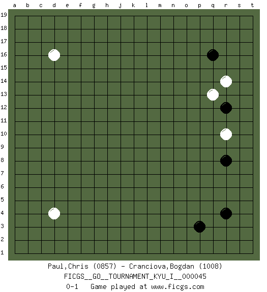 Last move : 0-1 2013 May 17 22:48:19 [Event "FICGS__GO__TOURNAMENT_KYU_I__000045"] [Site "FICGS"] [Date "2013.04.02"] [Round "1"] [Black "Paul,Chris"] [White "Cranciova,Bogdan"] [Result "0-1"] [Rating 1 "0857"] [Rating 2 "1008"] 1.q16 d4 2.r4 d16 3.p3 r10 4.r8 r14 5.r12 q13 0-1 This go game has been lost on time (started : 2013.04.02 9:14:41) Here are the names of the openings (joseki) played in the four corners : Corner q16 : q16 r14 Hoshi (Hwajeom, Seongjeom, Xingwei`) 4-4 Point. The star or hoshi (4-4) point, emphasizing influence at the potential expense of territory. Ikken Kakari (Hankan Keolch'im, Yi Gua`jiao~, 1-Space Low Approach). White 2 is the standard approach move to the 4-4. Player White won this Go (weiqi, baduk) game. Follow this game move after move (download)Go is to western chess what philosophy is to double entry accounting. (from Shibumi, by Trevanian) The worth of a book is to be measured by what you can carry away from it. (James Bryce)