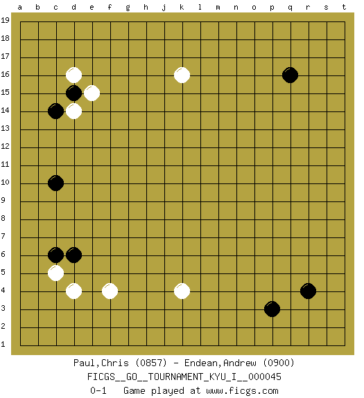 Last move : 0-1 2013 May 12 22:30:38 [Event "FICGS__GO__TOURNAMENT_KYU_I__000045"] [Site "FICGS"] [Date "2013.04.02"] [Round "1"] [Black "Paul,Chris"] [White "Endean,Andrew"] [Result "0-1"] [Rating 1 "0857"] [Rating 2 "0900"] 1.q16 d4 2.r4 d16 3.p3 k4 4.c10 k16 5.c6 c5 6.d6 f4 7.c14 d14 8.d15 e15 0-1 This go game has been lost on time (started : 2013.04.02 9:14:41) Here are the names of the openings (joseki) played in the four corners : Corner d4 : d4 c6 Hoshi (Hwajeom, Seongjeom, Xingwei`) 4-4 Point. The star or hoshi (4-4) point, emphasizing influence at the potential expense of territory. Ikken Kakari (Hankan Keolch'im, Yi Gua`jiao~, 1-Space Low Approach). Black 2 is the standard approach move to the 4-4. Corner d16 : d16 c14 Hoshi (Hwajeom, Seongjeom, Xingwei`) 4-4 Point. The star or hoshi (4-4) point, emphasizing influence at the potential expense of territory. Ikken Kakari (Hankan Keolch'im, Yi Gua`jiao~, 1-Space Low Approach). Black 2 is the standard approach move to the 4-4. Player White won this Go (weiqi, baduk) game. Follow this game move after move (download)On the third line, four die, six live. (Anonymous) Hardware: the parts of a computer that can be kicked. (Jeff Persis)