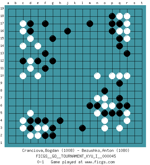 Last move : 0-1 2013 June 23 1:29:59 [Event "FICGS__GO__TOURNAMENT_KYU_I__000045 "] [Site "FICGS"] [Date "2013.04.02"] [Round "1"] [Black "Cranciova,Bogdan "] [White "Bezushko,Anton "] [Result "0-1"] [Rating 1 "1008"] [Rating 2 "1080"] 1.d4 r16 2.d16 q3 3.q5 r5 4.r6 r4 5.q7 o3 6.p17 r10 7.r13 p10 8.q15 q16 9.p16 r15 10.q14 q18 11.m17 f3 12.h4 c3 13.d3 c4 14.f4 d5 15.g3 d2 16.f2 e3 17.e4 e2 18.g2 c14 19.c12 e14 20.f17 c10 21.e12 e10 22.g12 c17 23.d17 c16 24.j16 d15 25.g15 f12 26.f13 d12 27.f11 d11 28.q17 r17 29.p18 r18 30.l3 p6 31.p5 o6 32.q6 o4 33.q9 q10 34.o8 n10 35.o5 n5 36.n6 n7 37.m6 o7 0-1 This go game has been lost on time (started : 2013.04.02 9:14:41) Here are the names of the openings (joseki) played in the four corners : Corner q4 : q3 q5Komoku (Somok, Xiao~mu`) 3-4 Point. The komoku (3-4) point is the traditional corner enclosure move..Ikken Takagakari (Hankan Nop'dakeolch'im, Yi Gaogua`jiao~, 1-Space High Approach). The 5-4 approach move has become more popular in modern times, as modern Go emphasizes speed and influence. Corner q16 : r16 p17Komoku (Somok, Xiao~mu`) 3-4 Point. The komoku (3-4) point is the traditional corner enclosure move..Ikken Kakari (Hankan Keolch'im, Yi Gua`jiao~, 1-Space Low Pincer). The small knight move is the basic approach move to the 3-4 point stone. It has been continually used for over four centuries. There are limitless variations, with new moves constantly being discovered. Black 2 opens the door to a treaure store of joseki. Corner d4 : d4 f3Hoshi (Hwajeom, Seongjeom, Xingwei`) 4-4 Point. The star or hoshi (4-4) point, emphasizing influence at the potential expense of territory.Ikken Kakari (Hankan Keolch'im, Yi Gua`jiao~, 1-Space Low Approach). White 2 is the standard approach move to the 4-4. Corner d16 : d16 c14Hoshi (Hwajeom, Seongjeom, Xingwei`) 4-4 Point. The star or hoshi (4-4) point, emphasizing influence at the potential expense of territory.Ikken Kakari (Hankan Keolch'im, Yi Gua`jiao~, 1-Space Low Approach). White 2 is the standard approach move to the 4-4. Player White won this Go (weiqi, baduk) game.Follow this game move after move (download ) In an unreasonable situation, an unreasonable move is reasonable. (Tamino) Depression is just anger without enthusiasm. (Unknown)