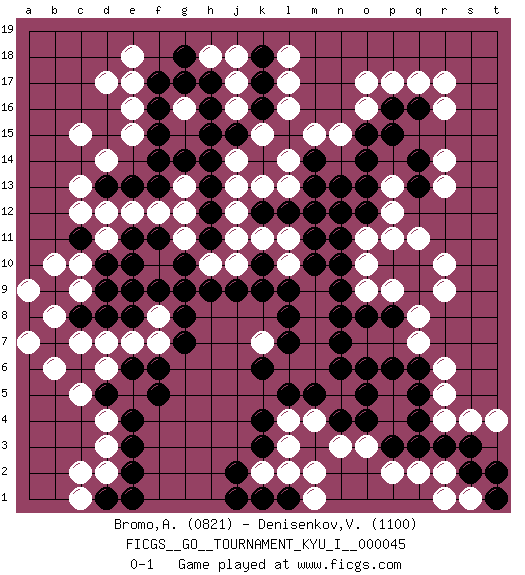 Last move : 0-1 2013 April 22 20:18:19 [Event "FICGS__GO__TOURNAMENT_KYU_I__000045"] [Site "FICGS"] [Date "2013.04.02"] [Round "1"] [Black "Bromo,Alexis"] [White "Denisenkov,Valentin"] [Result "0-1"] [Rating 1 "0821"] [Rating 2 "1100"] 1.q16 d3 2.q4 d17 3.d10 r14 4.q10 o17 5.p15 r17 6.k4 o3 7.k16 q17 8.k10 c13 9.f14 c7 10.f6 o10 11.o6 p12 12.o13 p13 13.f17 e12 14.e13 d12 15.e4 d4 16.d5 c5 17.e3 g12 18.f11 f12 19.f13 l3 20.k3 l4 21.l5 q2 22.p3 p2 23.q3 r2 24.r3 g11 25.g10 f10 26.e11 h10 27.g9 j12 28.h13 j10 29.j9 k11 30.h9 l10 31.k9 l17 32.k17 n15 33.o14 l14 34.k14 r16 35.o12 o11 36.n11 n12 37.n13 m12 38.m11 l11 39.m13 l13 40.l12 m12 41.n12 q11 42.m10 m9 43.l9 k13 44.n9 m8 45.n8 m7 46.n7 m6 47.m5 k7 48.l7 l6 49.l8 n5 50.k6 m4 51.n6 q7 52.o5 p9 53.p10 r10 54.q9 r9 55.p8 o9 56.o8 q8 57.n4 n3 58.o4 e16 59.f16 k2 60.j2 m2 61.k1 l2 62.l1 e7 63.e9 e5 64.e6 d6 65.f5 k15 66.j15 j14 67.h14 f8 68.f9 d11 69.e10 c10 70.d8 c9 71.d9 d7 72.d5 r5 73.q5 l16 74.h12 j13 75.h11 j16 76.h15 j17 77.k18 j18 78.h16 l18 79.h17 h18 80.g18 d2 81.e2 e15 82.f15 d14 83.d13 g13 84.g14 c15 85.c8 b8 86.b9 b10 87.b7 a9 88.e8 f7 89.g7 b6 90.g8 a7 91.m12 j11 92.k12 e18 93.n10 p11 94.p6 r6 95.q6 g16 96.g17 e17 97.m14 m15 98.o15 o16 99.p16 p17 100.q14 r13 101.q13 m1 102.j1 s4 103.s3 r4 104.s2 s1 105.t2 t4 106.t1 r1 107.d1 c1 108.e1 c2 109.c11 c12 0-1 Here are the names of the openings (joseki) played in the four corners : Corner q16 : q16 r14 Hoshi (Hwajeom, Seongjeom, Xingwei`) 4-4 Point. The star or hoshi (4-4) point, emphasizing influence at the potential expense of territory. Ikken Kakari (Hankan Keolch'im, Yi Gua`jiao~, 1-Space Low Approach). White 2 is the standard approach move to the 4-4. Corner q4 : q4 o3 Hoshi (Hwajeom, Seongjeom, Xingwei`) 4-4 Point. The star or hoshi (4-4) point, emphasizing influence at the potential expense of territory. Ikken Kakari (Hankan Keolch'im, Yi Gua`jiao~, 1-Space Low Approach). White 2 is the standard approach move to the 4-4. Player White won this Go (weiqi, baduk) game. Follow this game move after move (download)Keep inessential ataris till the end. (Anonymous) Perhaps the current trend of many chess professionals taking up the more lucrative pastime of poker is not a wholly negative one. It may not be too late for humans to relearn how to take risks in order to innovate and thereby maintain the advanced lifestyles we enjoy. And if it takes a poker-playing supercomputer to remind us that we can't enjoy the rewards without taking the risks, so be it. (The Chess Master and the Computer, by Garry Kasparov - 2010)