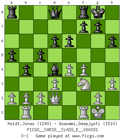 Last move : 0-1 2007 April 28 13:1:33 [Event "FICGS__CHESS__CLASS_E__000031"] [Site "FICGS"] [Date "2007.01.28"] [Round "1"] [White "Holdt,Jonas"] [Black "Goswami,Deepjyoti"] [Result "0-1"] [WhiteElo "1240"] [BlackElo "1510"] 1.e4 c5 2.Nf3 d6 3.Bc4 Bg4 4.O-O Nc6 5.h3 Bh5 6.Be2 Nf6 7.Nc3 a6 8.d3 e6 9.Bg5 Be7 10.Nh4 Bxe2 11.Qxe2 Nd4 12.Qd2 O-O 13.f4 h6 14.Bxf6 Bxf6 15.Nf3 b5 16.Rab1 b4 17.Ne2 a5 18.Nexd4 Bxd4+ 0-1 This chess game has been lost on time (started : 2007.01.28 15:4:48) Sicilian Kingside Castling by player White (move 4) Kingside Castling by player Black (move 12) Player Black won this chess game. Follow this game move after move (download)Chess teaches you to control the initial excitement you feel when you see something that looks good and it trains you to think objectively when you're in trouble. (Stanley Kubrick) Ein typischer, sehr verbreiteter Gedankenschädling ist der, daß der betreffende Amateur von der Annanhme ausgeht, daß jeder einzelne Zug etwas zu leisten habe. (Aaron Nimzowitsch) El hombre es un frívolo, una creatura engañosa y como un jugador de Ajedrez, se preocupa mas por el proceso de obtener su meta que de la meta por sí misma. (Dostoyevsky) J'ai vu le vaincu d'Echecs jouer des années durant dans l'espoir de la fête de la victoire. Car tu es plus riche de ce qu'elle existe si même elle n'est point pour toi. Ainsi de la perle du fond des mers. (Antoine de Saint-Exupéry) Without deviation from the norm, progress is not possible. (Frank Zappa)