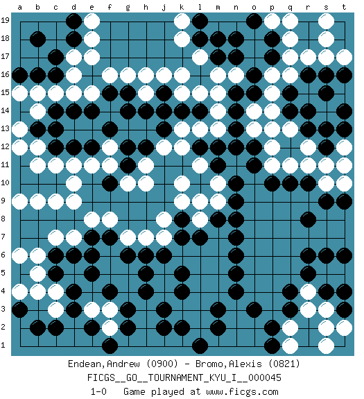 Last move : 1-0 2013 May 9 6:8:43 [Event "FICGS__GO__TOURNAMENT_KYU_I__000045"] [Site "FICGS"] [Date "2013.04.02"] [Round "1"] [Black "Endean,Andrew"] [White "Bromo,Alexis"] [Result "1-0"] [Rating 1 "0900"] [Rating 2 "0821"] 1.q4 d16 2.d4 q16 3.q10 d10 4.k4 k16 5.r14 k10 6.o16 p15 7.o15 o14 8.q15 p16 9.n14 m14 10.n13 o13 11.n15 m15 12.o12 p13 13.m12 m13 14.n12 p12 15.o11 p11 16.p10 q11 17.n10 m9 18.n9 m10 19.m11 l11 20.l12 k12 21.d8 f8 22.e7 e8 23.f7 g7 24.g6 h7 25.h6 j7 26.j6 k6 27.k5 l6 28.n7 m7 29.m8 l8 30.n8 m6 31.n6 m5 32.n5 m4 33.n4 l13 34.k8 l9 35.c17 d17 36.c16 c15 37.d18 e18 38.d19 e19 39.b18 b15 40.b16 a15 41.a16 e17 42.f13 f12 43.e12 e11 44.d12 d11 45.c12 c11 46.d14 d15 47.e14 e15 48.f15 f16 49.g12 f11 50.g15 g16 51.h14 k13 52.h12 h11 53.j13 j12 54.g14 h16 55.j15 j16 56.m3 l3 57.m2 k3 58.j3 l4 59.j2 d9 60.c8 c9 61.b8 b9 62.a8 a9 63.c6 b12 64.b13 b11 65.c14 b14 66.m17 m16 67.n17 l17 68.l18 k18 69.l19 k19 70.m18 n16 71.p17 q17 72.p18 q18 73.r16 r17 74.s16 s17 75.t16 t17 76.r13 r11 77.s12 s11 78.r10 s10 79.s9 p19 80.o19 q19 81.n18 s18 82.q14 p14 83.t14 s19 84.g11 g10 85.f10 h10 86.k14 k15 87.l14 l15 88.j14 h15 89.k2 l2 90.l1 t10 91.t9 a13 92.c13 a12 93.k7 j8 94.r6 k9 95.s15 r3 96.q3 r4 97.r5 s5 98.s6 t5 99.t3 q2 100.p2 q1 101.p1 s2 102.t6 s1 103.s4 s3 104.t4 t2 105.o3 c3 106.d3 c4 107.c2 b5 108.c5 b6 109.b7 b4 110.a3 a4 111.b2 a6 112.a7 d7 113.d6 c7 114.e5 f6 115.e6 f5 116.f4 g5 117.h5 g4 118.h4 f3 119.g3 e3 120.e2 f2 121.g2 t12 122.t13 t11 123.r8 r12 124.s13 q13 125.f1 l5 126.l7 1-0 Here are the names of the openings (joseki) played in the four corners : Corner q16 : q16 r14 Hoshi (Hwajeom, Seongjeom, Xingwei`) 4-4 Point. The star or hoshi (4-4) point, emphasizing influence at the potential expense of territory. Ikken Kakari (Hankan Keolch'im, Yi Gua`jiao~, 1-Space Low Approach). Black 2 is the standard approach move to the 4-4. Corner q4 : q4 m9 Hoshi (Hwajeom, Seongjeom, Xingwei`) 4-4 Point. The star or hoshi (4-4) point, emphasizing influence at the potential expense of territory. Corner d16 : d16 c17 Hoshi (Hwajeom, Seongjeom, Xingwei`) 4-4 Point. The star or hoshi (4-4) point, emphasizing influence at the potential expense of territory. Player Black won this Go (weiqi, baduk) game. Follow this game move after move (download)There is no territory in the centre. (Anonymous) A cynic is a man who knows the price of everything but the value of nothing. (Oscar Wilde)