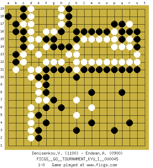 Last move : 1-0 2013 April 28 20:41:55 [Event "FICGS__GO__TOURNAMENT_KYU_I__000045"] [Site "FICGS"] [Date "2013.04.02"] [Round "1"] [Black "Denisenkov,Valentin"] [White "Endean,Andrew"] [Result "1-0"] [Rating 1 "1100"] [Rating 2 "0900"] 1.q16 d4 2.r4 d16 3.p3 r14 4.q11 p14 5.o16 o12 6.q8 r17 7.r16 p16 8.p17 p15 9.s16 o15 10.n16 n15 11.m16 m15 12.l16 l15 13.k15 k14 14.f4 d6 15.f6 e8 16.c14 c12 17.e14 f16 18.g14 h15 19.j14 j15 20.k16 j13 21.h14 k13 22.g15 g16 23.h16 h17 24.j17 j16 25.h16 h18 26.l11 l12 27.m11 m12 28.j11 h12 29.h11 g12 30.g11 f12 31.f11 e11 32.e10 d11 33.f8 e9 34.f9 d10 35.k3 k11 36.k10 k12 37.n11 n12 38.o11 p12 39.p11 q12 40.r11 r12 41.e3 d3 42.e2 d2 43.b16 c17 44.b17 d14 45.b13 c13 46.c15 d15 47.b12 b11 48.c18 d18 49.c16 d17 50.c19 d19 51.a18 m6 52.m4 k7 53.m8 k5 54.h6 f7 55.g7 e7 56.e5 d5 57.f10 e13 58.j18 h19 59.j19 f14 60.f15 e15 61.s14 r15 62.s15 s13 63.s11 s12 64.q15 q14 65.q17 1-0 Here are the names of the openings (joseki) played in the four corners : Corner q16 : q16 r14 Hoshi (Hwajeom, Seongjeom, Xingwei`) 4-4 Point. The star or hoshi (4-4) point, emphasizing influence at the potential expense of territory. Ikken Kakari (Hankan Keolch'im, Yi Gua`jiao~, 1-Space Low Approach). White 2 is the standard approach move to the 4-4. Corner d4 : d4 f4 Hoshi (Hwajeom, Seongjeom, Xingwei`) 4-4 Point. The star or hoshi (4-4) point, emphasizing influence at the potential expense of territory. Ikken Takagakari (Hankan Nop'dakeolch'im, Yi Gaojia, 1-Space High Approach). White typically responds at 6-4 or 3-10. White 4-10 is played when White finds play on the right side advantageous. White 4-8 or 3-8 may be played when White has support at top. Corner d16 : d16 c14 Hoshi (Hwajeom, Seongjeom, Xingwei`) 4-4 Point. The star or hoshi (4-4) point, emphasizing influence at the potential expense of territory. Ikken Kakari (Hankan Keolch'im, Yi Gua`jiao~, 1-Space Low Approach). Black 2 is the standard approach move to the 4-4. Player Black won this Go (weiqi, baduk) game. Follow this game move after move (download)Don't make empty triangles. (Anonymous) Whatever you do, don't be bored. This is absolutely the most exciting time we could have possibly hoped to be alive. And things are just starting. (From movie Waking life)