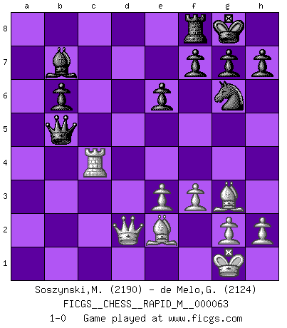 Last move : 1-0 2013 May 9 7:31:38 [Event "FICGS__CHESS__RAPID_M__000063"] [Site "FICGS"] [Date "2013.04.04"] [Round "1"] [White "Soszynski,Marek"] [Black "de Melo,Gerson Luis"] [Result "1-0"] [WhiteElo "2190"] [BlackElo "2124"] 1.d4 Nf6 2.c4 e6 3.Nc3 Bb4 4.Qc2 O-O 5.a3 Bxc3+ 6.Qxc3 b6 7.Bg5 Bb7 8.e3 d6 9.Ne2 Nbd7 10.Qc2 c5 11.Rd1 Rc8 12.Nc3 cxd4 13.Rxd4 Rc5 14.Bh4 Qa8 15.Be2 d5 16.b4 R5c8 17.O-O dxc4 18.f3 a6 19.Qd2 Ne5 20.a4 Nd5 21.Bg3 Ng6 22.b5 axb5 23.axb5 Qa5 24.Rc1 Nxc3 25.Rxc3 Qxb5 26.Rdxc4 Rxc4 27.Rxc4 1-0 Nimzo-Indian : Classical variation Kingside Castling by player Black (move 4) Kingside Castling by player White (move 17) Player White won this chess game. Follow this game move after move (download)A Chess game is divided into three stages: the first, when you hope you have the advantage, the second when you believe you have an advantage, and the third... when you know you're going to lose ! (Savielly Tartakower) Ich verachte die Medien. (Robert James Fischer) Yo adoro todas la posiciones. Denme una partida posicional difícil, y la jugaré. Pero posiciones totalmente ganadas, no las tolero. (Hein Donner) La guerre est enfant de la passion, la passion est enfant du narcissisme et le narcissisme est l'enfant. (...) Une autre partie ? (Thibault de Vassal) The next best thing to gambling and winning is gambling and loosing. (Nick Dandalos)