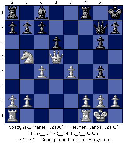 Last move : 1/2-1/2 2013 April 21 23:52:21 [Event "FICGS__CHESS__RAPID_M__000063"] [Site "FICGS"] [Date "2013.04.04"] [Round "1"] [White "Soszynski,Marek"] [Black "Helmer,Janos"] [Result "1/2-1/2"] [WhiteElo "2190"] [BlackElo "2102"] 1.d4 Nf6 2.c4 g6 3.Nc3 Bg7 4.e4 d6 5.Nf3 O-O 6.Be2 e5 7.O-O Nc6 8.Be3 Ng4 9.Bg5 f6 10.Bc1 exd4 11.Nxd4 Nxd4 12.Qxd4 f5 13.Qd5+ Kh8 14.Bxg4 fxg4 15.Be3 Be5 16.Bd4 Qf6 17.Bxe5 Qxe5 18.Nb5 Qg7 1/2-1/2 King's Indian : Orthodox, Aronin-Taimanov variation (Yugoslav attack / Mar del Plata variation) Kingside Castling by player Black (move 5) Kingside Castling by player White (move 7) This chess game ended in a draw. Follow this game move after move (download)What is the object of playing a gambit opening?... To acquire a reputation of being a dashing player at the cost of losing a game. (Siegbert Tarrasch) Glücklicherweise sind Großmeister Ruben Fines reine Schachbücher weniger phallozentrisch [als seine Schachpsychologie] und deswegen auch weniger lächerlich. (Nigel Short) El Ajedrez tiene tanto misterio como las mujeres. (Purdy) Le profane ne songe pas à la somme de jouissance dont il se prive, qui méconnaît ce jeu aux ressources aussi variées que passionnantes. (Jean-Marie Jeanton-Lamarche) Man is reluctant to give credit for intelligence to anyone, except his enemies. (Albert Einstein)