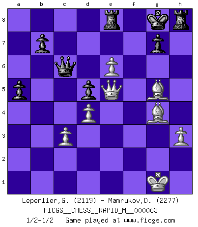 Last move : 1/2-1/2 2013 May 27 19:11:26 [Event "FICGS__CHESS__RAPID_M__000063"] [Site "FICGS"] [Date "2013.04.04"] [Round "1"] [White "Leperlier,Gabriel"] [Black "Mamrukov,Dmitri"] [Result "1/2-1/2"] [WhiteElo "2119"] [BlackElo "2277"] 1.e4 e6 2.Nf3 d5 3.e5 c5 4.b4 cxb4 5.a3 Nh6 6.d4 Nf5 7.axb4 Bxb4+ 8.c3 Be7 9.g4 Nh4 10.Nxh4 Bxh4 11.Bd3 Be7 12.O-O a6 13.f4 Nc6 14.f5 Bd7 15.Qe2 h6 16.Nd2 Rc8 17.Rb1 Na5 18.Bb2 Rc6 19.Ra1 Rb6 20.Bc1 Nb3 21.Nxb3 Rxb3 22.Qc2 Rb6 23.Rf3 Qc8 24.Bf4 h5 25.Rh3 Rc6 26.Bd2 Rg8 27.Rxh5 exf5 28.g5 f4 29.g6 fxg6 30.Bxg6+ Kd8 31.Rf1 Bg4 32.Rxf4 Bxh5 33.Bxh5 Rh6 34.Bg4 Qc6 35.h3 R6h8 36.Rf7 Rf8 37.Rxe7 Kxe7 38.Bg5+ Kf7 39.e6+ Kg8 40.Qd3 a5 41.Qg3 Re8 42.Qe5 1/2-1/2 French : Wing gambit Kingside Castling by player White (move 12) This chess game ended in a draw. Follow this game move after move (download)A good player is always lucky. (Jose Raul Capablanca) Im Wettkampf zwischen starken Meistern kommen Fehler sehr selten vor, deshalb ist es mit bloßem Warten nicht getan. (José Raúl Capablanca) La táctica fluye a partir de una posición superior. (Bobby Fischer) À la honte des hommes, on sait que les lois du jeu sont les seules qui soient partout justes, claires, inviolables et exécutées. Pourquoi l'Indien qui a donné les règles du jeu d'échecs est-il obéi de bon gré dans toute la terre, et que les décrétales des papes, par exemple, sont aujourd'hui un objet d'horreur et de mépris ? C'est que l'inventeur des échecs combina tout avec justesse pour la satisfaction des joueurs, et que les papes, dans leurs décrétales, n'eurent en vue que leur seul avantage. L'Indien voulut exercer également l'esprit des hommes et leur donner du plaisir; les papes ont voulu abrutir l'esprit des hommes. Voltaire (Dictionnaire philosophique / Garnier 1967) Warrior pose battles inner weakness and wins focus. You see that there is no war within you. You're on your own side, and you are your own strength. (Terri Guillemets)