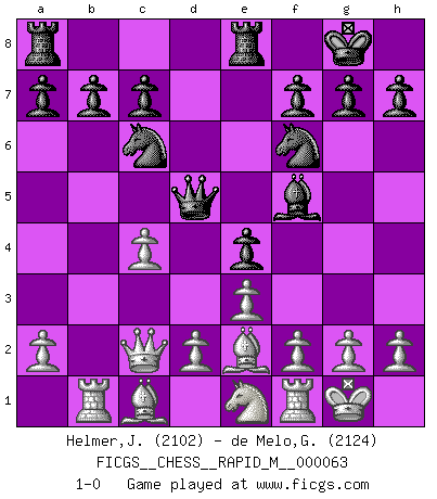 Last move : 1-0 2013 May 9 7:32:52 [Event "FICGS__CHESS__RAPID_M__000063"] [Site "FICGS"] [Date "2013.04.04"] [Round "1"] [White "Helmer,Janos"] [Black "de Melo,Gerson Luis"] [Result "1-0"] [WhiteElo "2102"] [BlackElo "2124"] 1.c4 e5 2.Nc3 Nf6 3.e3 Nc6 4.Nf3 Bb4 5.Qc2 O-O 6.Be2 Re8 7.O-O e4 8.Ne1 Bxc3 9.bxc3 d5 10.cxd5 Qxd5 11.Rb1 Bf5 12.c4 1-0 English Opening Kingside Castling by player Black (move 5) Kingside Castling by player White (move 7) Player White won this chess game. Follow this game move after move (download)When I asked Fischer why he had not played a certain move in our game, he replied: 'Well, you laughed when I wrote it down !' (Mikhail Tal) Das Spiel gibt uns die Genugtuung, die das Leben uns versagt. (Emanuel Lasker) Te sientas frente a un tablero y repentinamente tu corazón brinca. Tu mano tiembla al tomar una pieza y moverla. Pero lo que el Ajedrez te enseña es que tu debes permanecer ahí con calma y pensar de que si realmente es una buena idea o de que si hay otras ideas mejores. (Stanley Kubrick) Aucun coup ne doit être joué sans but. (Pedro Damiano) It's not the will to win, but the will to prepare to win that makes the difference. (Bear Bryant)