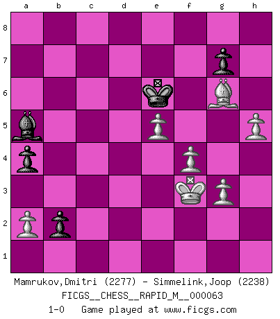 Last move : 1-0 2013 April 23 10:36:42 [Event "FICGS__CHESS__RAPID_M__000063"] [Site "FICGS"] [Date "2013.04.04"] [Round "1"] [White "Mamrukov,Dmitri"] [Black "Simmelink,Joop"] [Result "1-0"] [WhiteElo "2277"] [BlackElo "2238"] 1.Nf3 d5 2.d4 c6 3.c4 Nf6 4.Qc2 dxc4 5.Qxc4 Bf5 6.g3 e6 7.Bg2 Be7 8.O-O O-O 9.e3 Nbd7 10.Qe2 c5 11.Rd1 Qc7 12.Nc3 Ne4 13.Ne1 Nxc3 14.bxc3 Rac8 15.e4 Bg6 16.Nd3 cxd4 17.cxd4 Qc2 18.Qxc2 Rxc2 19.Nf4 Nb6 20.h4 h6 21.Nxg6 fxg6 22.Bd2 Nc4 23.Be1 b5 24.e5 Nb2 25.Rd2 Rxd2 26.Bxd2 Nc4 27.Rd1 Rd8 28.d5 Nxd2 29.Rxd2 exd5 30.Bxd5+ Kf8 31.Rd3 Bc5 32.Kg2 Ke7 33.f4 Bb6 34.Kf3 b4 35.Rd2 Rd7 36.Rd1 Rd8 37.Ke4 Rc8 38.Bb3 Rd8 39.Rc1 Rd4+ 40.Kf3 Rd3+ 41.Kg2 Kd7 42.Bc2 Rd2+ 43.Kh3 Kd8 44.Bb3 h5 45.Rc2 Be3 46.Rxd2+ Bxd2 47.Bc2 a5 48.Bxg6 a4 49.Bxh5 b3 50.Bf7 b2 51.Bg6 Kd7 52.Kg4 Ke6 53.Kf3 Ba5 54.h5 1-0 Reti Opening Kingside Castling by player White (move 8) Kingside Castling by player Black (move 8) Player White won this chess game. Follow this game move after move (download)Not only will I predict his triumph over Botvinnik, but I'll go further and say that he'll probably be the greatest Chess player that ever lived. (John Collins) Habe Mut, dich deines eigenen Verstandes zu bedienen. (Immanuel Kant) Una mala movida nulifica cuarenta buenas. (Horowitz) Même si vous avez un bon coup à faire, regardez toujours s'il n'y en a pas un qui lui soit préférable. (Pedro Damiano) A clear conscience is usually the sign of a bad memory. (Unknown)