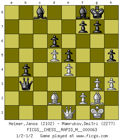 Last move : 1/2-1/2 2013 July 9 21:34:52 [Event "FICGS__CHESS__RAPID_M__000063"] [Site "FICGS"] [Date "2013.04.04"] [Round "1"] [White "Helmer,Janos"] [Black "Mamrukov,Dmitri"] [Result "1/2-1/2"] [WhiteElo "2102"] [BlackElo "2277"] 1.c4 Nf6 2.Nc3 c5 3.g3 e6 4.Nf3 b6 5.Bg2 Bb7 6.O-O Be7 7.d4 cxd4 8.Qxd4 d6 9.Rd1 a6 10.b3 Nbd7 11.e4 Qc8 12.Bb2 O-O 13.Qe3 Qc7 14.Rd2 Rac8 15.Rad1 Rfe8 16.Nd4 Bf8 17.Re2 h6 18.h3 h5 19.Nf3 Qb8 20.Nd4 Qc7 21.Rc2 Ba8 22.Ba3 Nc5 23.Bb2 e5 24.Nde2 Ncd7 25.Rcd2 Qb8 26.Nd5 b5 27.Rc1 Bb7 28.Rdc2 Nxd5 29.cxd5 b4 30.Rxc8 Rxc8 31.a3 a5 32.axb4 axb4 33.Rxc8 Bxc8 34.Bc1 Qa8 35.Bd2 Qa3 36.Nc1 Nc5 37.Qe1 Nxb3 38.Nxb3 Qxb3 1/2-1/2 English Opening Kingside Castling by player White (move 6) Kingside Castling by player Black (move 12) This chess game ended in a draw. Follow this game move after move (download)Help your pieces so they can help you. (Paul Morphy) Kritik überlasse ich den Spießern. Ich zeige nichts, wofür ich mich schämen muss. (Alexandra Kosteniuk) Alguna parte de un error es siempre correcto. (Savielly Tartakover) Demandez au pauvre Cg1 ce qu'il en pense. Eduard Gufeld à propos de la variante Saemisch de l'Est-Indienne. Life is like a game of cards: the hand you are dealt represents determinism; the way you play it is free will. (Jawaharlal Nehru)