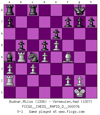 Last move : 0-1 2013 June 13 16:35:26 [Event "FICGS__CHESS__RAPID_D__000076"] [Site "FICGS"] [Date "2013.04.04"] [Round "1"] [White "Budnar,Milos"] [Black "Vermeulen,Aad"] [Result "0-1"] [WhiteElo "1336"] [BlackElo "1307"] 1.e4 e6 2.d4 d5 3.Nc3 Bb4 4.e5 c5 5.a3 Bxc3+ 6.bxc3 cxd4 7.cxd4 Nc6 8.Bb5 Qa5+ 9.Bd2 Qxb5 10.Ne2 Qb6 11.c3 Nge7 12.O-O O-O 13.Ng3 Na5 14.Qg4 Ng6 15.Rfb1 Qd8 16.h4 Qxh4 17.Qxh4 Nxh4 18.Rb4 Nc4 19.Bg5 Ng6 20.Ne2 b6 21.Ra2 Bd7 22.Nf4 Nxf4 23.Bxf4 Rfc8 24.Rb1 Ba4 25.Rb4 b5 0-1 French : Winawer, Advance variation Kingside Castling by player White (move 12) Kingside Castling by player Black (move 12) Player Black won this chess game. Follow this game move after move (download)Chess is imagination. (David Bronstein) Ohne Fehler kann es keine Brillanz geben. (Emanuel Lasker) Aunque la mayoría de la gente disfruta observar las partidas de los grandes Maestros de ataque, algunos de los jugadores mas notables en la historia han sido los jugadores silenciosos posicionales. Lentamente ellos te aplastan despojandote de tu espacio, congestionando tus piezas y dejandote virtualmente sin nada que hacer. (Yasser Seirawan) Les réformistes prétendent que les progrès de la théorie conduiront à la disparition des échecs, et qu'il faut, pour leur rendre vie, en remanier les règles. En réalité, qu'exprime cette affirmation? Le mépris de l'intuition, de l'imagination et de tous les autres éléments qui font des échecs un art. (Alexander Alekhine) A journey of a thousand sites begins with a single click. (Author unknown)