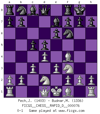 Last move : 0-1 2013 May 18 10:51:37 [Event "FICGS__CHESS__RAPID_D__000076"] [Site "FICGS"] [Date "2013.04.04"] [Round "1"] [White "Pech,Jaroslav senior"] [Black "Budnar,Milos"] [Result "0-1"] [WhiteElo "1403"] [BlackElo "1336"] 1.d4 d5 2.Nf3 Nf6 3.Bf4 e6 4.e3 c5 5.Nbd2 Be7 6.c3 O-O 0-1 This chess game has been lost on time (started : 2013.04.04 8:56:22) Queen's Bishop game Kingside Castling by player Black (move 6) Player Black won this chess game. Follow this game move after move (download)Don't even mention losing to me. I can't stand to think of it. (Bobby Fischer) Smyslow ist ein Beweis dafür, dass ich noch zehn Jahre spielen kann! [der 75 jährige über den 85 jährigen] (Viktor Kortschnoi) En el tablero, la mentira e hipocresía no sobreviven mucho. (Emanuel Lasker) Seul un grand joueur sait à quel point il joue faiblement. (Xavier Tartacover) Before all elsed, be armed. (Niccolo Machiavelli)