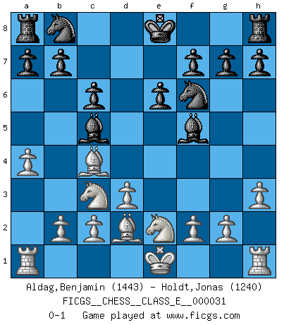 Last move : 0-1 2007 April 15 11:9:8 [Event "FICGS__CHESS__CLASS_E__000031"] [Site "FICGS"] [Date "2007.01.28"] [Round "1"] [White "Aldag,Benjamin"] [Black "Holdt,Jonas"] [Result "0-1"] [WhiteElo "1443"] [BlackElo "1240"] 1.e4 d5 2.exd5 Qxd5 3.Nc3 Qa5 4.Bc4 c6 5.d3 Nf6 6.Bd2 Qe5+ 7.Qe2 Qxe2+ 8.Ngxe2 Bf5 9.a4 e6 10.h3 Bc5 0-1 Scandinavian (centre counter) defense Player Black won this chess game. Follow this game move after move (download)A man that will take back a move at Chess will pick a pocket. (Richard Fenton) Schach ist ein Reich, wo sich die menschliche Phantasie frei entfalten kann. (David Bronstein) El Ajedrez lo es todo: arte, ciencia y deporte. (Anatoly Karpov) Aux échecs, l'amour-propre est satisfait quand on remporte la victoire, mais il n'y a pas de honte à être battu. (Benjamin Franklin) In theory there is no difference between theory and practice. In practice there is. (Yogi Berra)