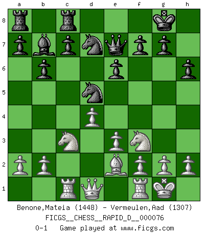 Last move : 0-1 2013 June 6 12:24:44 [Event "FICGS__CHESS__RAPID_D__000076"] [Site "FICGS"] [Date "2013.04.04"] [Round "1"] [White "Benone,Mateia"] [Black "Vermeulen,Aad"] [Result "0-1"] [WhiteElo "1448"] [BlackElo "1307"] 1.Nf3 d5 2.d4 Nf6 3.c4 e6 4.Nc3 Be7 5.Bg5 O-O 6.e3 h6 7.Bh4 b6 8.Rc1 Bb7 9.cxd5 Nxd5 10.Bxe7 Qxe7 11.Be2 Rc8 12.O-O Nd7 0-1 This chess game has been lost on time (started : 2013.04.04 8:56:22) Reti Opening Kingside Castling by player Black (move 5) Kingside Castling by player White (move 12) Player Black won this chess game. Follow this game move after move (download)Of Chess it has been said that life is not long enough for it, but that is the fault of life, not Chess. (William Ewart Napier) Ich verachte die Medien. (Robert James Fischer) Aún deseo matar a Fischer. (Boris Spassky) Vous savez, camarade Pachman, je n'éprouve pas de plaisir à être ministre, je jouerais plutôt aux échecs comme vous, ou alors ferais une révolution au Venezuela. (Che Guevara à Ludek Pachman, 'Checkmate in Prague', 1975) I take risks, sometimes patients die, but not taking risks causes more patients to die. So I guess my biggest problem is I've been cursed with the ability to do the math. (Gregory House, House M.D.)