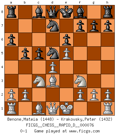 Last move : 0-1 2013 June 3 0:11:29 [Event "FICGS__CHESS__RAPID_D__000076"] [Site "FICGS"] [Date "2013.04.04"] [Round "1"] [White "Benone,Mateia"] [Black "Krakovsky,Peter"] [Result "0-1"] [WhiteElo "1448"] [BlackElo "1432"] 1.Nf3 Nf6 2.c4 e6 3.d4 d5 4.Nc3 c6 5.e3 Nbd7 6.Bd3 dxc4 7.Bxc4 b5 8.Bd3 a6 9.e4 c5 10.e5 Nd5 0-1 This chess game has been lost on time (started : 2013.04.04 8:56:22) Reti Opening Player Black won this chess game. Follow this game move after move (download)Chess is life. (Bobby Fischer) Glücklicherweise sind Großmeister Ruben Fines reine Schachbücher weniger phallozentrisch [als seine Schachpsychologie] und deswegen auch weniger lächerlich. (Nigel Short) Una mala movida nulifica cuarenta buenas. (Horowitz) La victoire dans une partie d'Echecs appartient la plupart du temps à celui qui voit un peu plus loin que l'adversaire. (Lasker) No, no, you're not thinking; you're just being logical. (Niels Bohr)