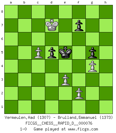 Last move : 1-0 2013 May 12 21:7:4 [Event "FICGS__CHESS__RAPID_D__000076"] [Site "FICGS"] [Date "2013.04.04"] [Round "1"] [White "Vermeulen,Aad"] [Black "Brulland,Emmanuel"] [Result "1-0"] [WhiteElo "1307"] [BlackElo "1373"] 1.d4 d5 2.c4 c6 3.Nf3 e6 4.Nc3 Nf6 5.e3 Be7 6.Bd3 O-O 7.O-O Re8 8.Qc2 h6 9.a3 Nbd7 10.cxd5 exd5 11.Bd2 Bf8 12.Rac1 g6 13.b4 Bg7 14.Rfd1 b5 15.a4 a6 16.axb5 axb5 17.Ra1 Bb7 18.h3 Qc7 19.Rdb1 Rxa1 20.Rxa1 Ra8 21.Rxa8+ Bxa8 22.Nxb5 Qb7 23.Nc3 Qb6 24.Na4 Qa7 25.Nc5 Nxc5 26.bxc5 Qa1+ 27.Qb1 Qxb1+ 28.Bxb1 Ne4 29.Ba5 Bb7 30.Bd3 Nf6 31.Kf1 Kf8 32.Ke2 Ke7 33.Kd2 Nd7 34.Kc2 Nb8 35.Kb3 Ba6 36.Bxa6 Nxa6 37.Ka4 Kd7 38.Bb6 Bf6 39.Ka5 Nc7 40.Bxc7 Kxc7 41.Ka6 Bg7 42.Ne5 Bxe5 43.dxe5 h5 44.g4 hxg4 45.hxg4 g5 46.Ka7 Kc8 47.Kb6 Kd7 48.Kb7 Ke6 49.Kxc6 Kxe5 50.Kd7 1-0 QGD Slav : 3.Nf3 Kingside Castling by player Black (move 6) Kingside Castling by player White (move 7) 10 pieces endgame at move 49 : White KPPPPP , Black KPPP WHITE : King + 5 Pawns BLACK : King + 3 Pawns 9 pieces endgame at move 49 : White KPPPP , Black KPPP WHITE : King + 4 Pawns BLACK : King + 3 Pawns Player White won this chess game. Follow this game move after move (download)A strong memory, concentration, imagination, and a strong will is required to become a great Chess player. (Bobby Fischer) Ja, jede Frau in Holland liebt mich bestimmt, und alle Männer hassen mich. (Loek van Wely) El Ajedrez es despiadado: debes de estar preparado para matar gente. (Nigel Short) Mais n'est-ce pas déjà le limiter injurieusement que d'appeler les échecs un jeu? N'est-ce pas aussi une science, un art, ou quelque chose qui, comme le cercueil de Mahomet entre ciel et terre, est suspendu entre l'un et l'autre, et qui réunit un nombre incroyable de contraires ? (Stefan Zweig) I don't diet. I just don't eat as much as I'd like to. (Linda Evangelista, supermodel)