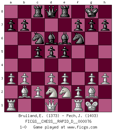 Last move : 1-0 2013 May 17 22:48:19 [Event "FICGS__CHESS__RAPID_D__000076"] [Site "FICGS"] [Date "2013.04.04"] [Round "1"] [White "Brulland,Emmanuel"] [Black "Pech,Jaroslav senior"] [Result "1-0"] [WhiteElo "1373"] [BlackElo "1403"] 1.b3 d5 2.e3 e5 3.Bb2 Bd6 4.g3 Nf6 5.Bg2 O-O 6.Ne2 c5 7.d3 Be6 8.Nd2 Nc6 9.O-O Rc8 10.a3 Re8 11.h3 1-0 This chess game has been lost on time (started : 2013.04.04 8:56:22) Nimzovich-Larsen attack : Classical variation Kingside Castling by player Black (move 5) Kingside Castling by player White (move 9) Player White won this chess game. Follow this game move after move (download)We must make sure that Chess will not be like a dead language, very interesting, but for a very small group. (Sytze Faber) Im Wettkampf zwischen starken Meistern kommen Fehler sehr selten vor, deshalb ist es mit bloßem Warten nicht getan. (José Raúl Capablanca) Tu sabes, camarada Pachman, no disfruto el ser un Ministro, preferería jugar al Ajedrez como tu. (Che Guevara) Les écrivains ont utilisé les échecs pour analyser les côtés extrêmes de la nature humaine. Dans ce cadre, les échecs offrent un champ d'expérimentation idéal. Mais on pourrait faire la même chose avec la peinture. Et là, en vous référant à Van Gogh, vous ne tirerez pas de conclusion définitive sur les peintres. (Gary Kasparov) Every man's memory is his private literature. (Aldous Huxley)