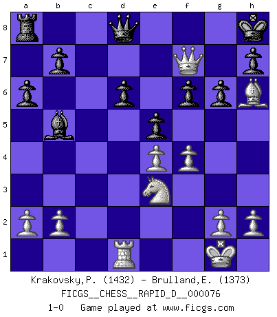 Last move : 1-0 2013 April 24 21:39:8 [Event "FICGS__CHESS__RAPID_D__000076"] [Site "FICGS"] [Date "2013.04.04"] [Round "1"] [White "Krakovsky,Peter"] [Black "Brulland,Emmanuel"] [Result "1-0"] [WhiteElo "1432"] [BlackElo "1373"] 1.c4 c5 2.Nf3 g6 3.e4 Bg7 4.d4 cxd4 5.Nxd4 Nc6 6.Be3 d6 7.Nc3 Nf6 8.Be2 O-O 9.O-O a6 10.Qd2 Nxd4 11.Bxd4 Be6 12.f4 Bg4 13.Bxf6 Bxe2 14.Bxg7 Bxf1 15.Bxf8 Bxc4 16.Bh6 f6 17.Nd5 e6 18.Ne3 Bb5 19.Rd1 e5 20.Qd5+ Kh8 21.Qf7 1-0 English : Symmetrical variation Kingside Castling by player Black (move 8) Kingside Castling by player White (move 9) Player White won this chess game. Follow this game move after move (download)Some sacrifices are sound; the rest are mine. (Mikhail Tal) Im Hotelzimmer gab es nur zwei Schaben. (Über die Turnierbedingungen) (Peter Swidler) Todos los Maestros de Ajedrez fueron un día unos principiantes. (Chernev) Les Echecs sont affaire de jugement sensible. Savoir quand frapper et quand esquiver. (Fischer) There is far too much law for those who can afford it and far too little for those who cannot. (Derek Bok)