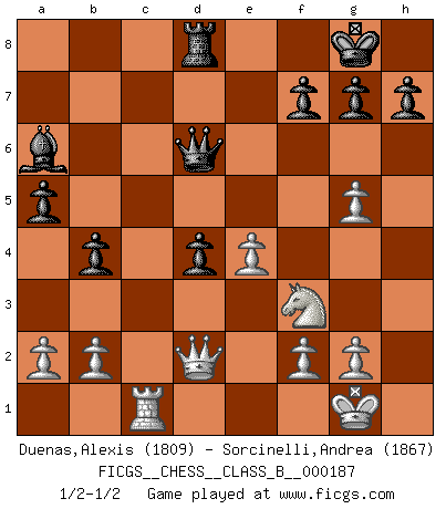 Last move : 1/2-1/2 2013 April 24 9:11:8 [Event "FICGS__CHESS__CLASS_B__000187"] [Site "FICGS"] [Date "2013.04.04"] [Round "1"] [White "Duenas,Alexis"] [Black "Sorcinelli,Andrea"] [Result "1/2-1/2"] [WhiteElo "1809"] [BlackElo "1867"] 1.d4 d5 2.c4 c6 3.e3 Nf6 4.Nc3 e6 5.Nf3 Nbd7 6.Bd3 dxc4 7.Bxc4 b5 8.Bd3 Bb7 9.e4 b4 10.Na4 c5 11.Nxc5 Bxc5 12.dxc5 O-O 13.Be3 Ng4 14.Bd4 e5 15.c6 Bxc6 16.Rc1 Rc8 17.h3 exd4 18.hxg4 Qb6 19.O-O Nc5 20.Re1 Bb7 21.Qd2 Nxd3 22.Qxd3 Rfd8 23.Rxc8 Bxc8 24.g5 a5 25.Rc1 Ba6 26.Qd2 Qd6 1/2-1/2 QGD Slav defense Kingside Castling by player Black (move 12) Kingside Castling by player White (move 19) This chess game ended in a draw. Follow this game move after move (download)A good sacrifice is one that is not necessarily sound but leaves your opponent dazed and confused. (Rudolph Spielmann) Frage des Reporters: -Worin besteht das Ziel von Gambiteröffnungen? Antwort: -Auf Kosten der Partie einen Ruf als Angriffspieler zu erwerben.- (Siegbert Tarrasch) Después de la respuesta de las negras a 1.e4 con 1..e5, se quedan siempre tratando de entrar dentro del juego. (Howard Staunton) Pour se monter efficace, un Cavalier a besoin d'avant-postes ! Les Cavaliers font les meilleurs bloqueurs de pions passés. Life is pleasant. Death is peaceful. It's the transition that's troublesome. (Isaac Asimov)
