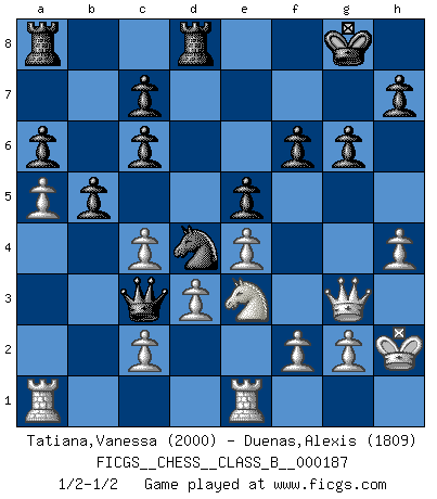 Last move : 1/2-1/2 2013 May 2 1:45:37 [Event "FICGS__CHESS__CLASS_B__000187"] [Site "FICGS"] [Date "2013.04.04"] [Round "1"] [White "Tatiana,Vanessa"] [Black "Duenas,Alexis"] [Result "1/2-1/2"] [WhiteElo "2000"] [BlackElo "1809"] 1.e4 e5 2.Nf3 Nc6 3.Bb5 a6 4.Ba4 Nf6 5.O-O Be7 6.Bxc6 dxc6 7.Re1 Qd6 8.d3 O-O 9.Nbd2 Be6 10.b3 Nd7 11.a4 f6 12.Ba3 Nc5 13.Qe2 Qd8 14.Nh4 g6 15.Qe3 Nd7 16.Bxe7 Qxe7 17.Qg3 Qb4 18.Nc4 Bxc4 19.bxc4 Rfd8 20.Nf5 Qc3 21.Ne3 Nc5 22.h4 Ne6 23.a5 Nd4 24.Kh2 b5 1/2-1/2 Ruy Lopez : Exchange variation doubly deferred (DERLD) Kingside Castling by player White (move 5) Kingside Castling by player Black (move 8) This chess game ended in a draw. Follow this game move after move (download)Do you realize Fischer almost never has any bad pieces? He exchanges them, and the bad pieces remain with his opponents. (Yuri Balashov) Ich erzeugte keinen Neid, da mich die Schachspieler als Musiker und die Musiker als Schachspieler betrachteten. (Mark Taimanov) Yo siempre he tenido un ligero sentimiento de lástima por una persona que no tiene conocimiento del Ajedrez. (Siegbert Tarrasch) Les Echecs ont trois composantes : le temps, l'espace et le matériel en dernier. (Mikhail Tal) Luck is what you have left over after you give 100 percent. (Langston Coleman)