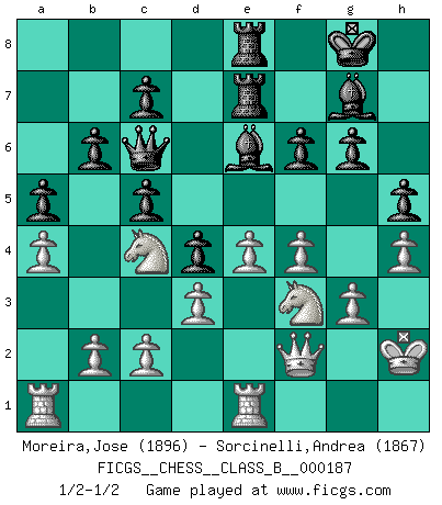 Last move : 1/2-1/2 2013 May 21 16:4:26 [Event "FICGS__CHESS__CLASS_B__000187"] [Site "FICGS"] [Date "2013.04.04"] [Round "1"] [White "Moreira,Jose"] [Black "Sorcinelli,Andrea"] [Result "1/2-1/2"] [WhiteElo "1896"] [BlackElo "1867"] 1.e4 e5 2.Nf3 Nc6 3.Bb5 a6 4.Ba4 Nf6 5.O-O Be7 6.Bxc6 dxc6 7.Re1 Nd7 8.d3 f6 9.Be3 Nc5 10.Nbd2 Ne6 11.Nh4 g6 12.a4 O-O 13.Nc4 b6 14.Nf3 Qd7 15.h3 a5 16.Bh6 Rd8 17.h4 Bb4 18.Rf1 Qf7 19.Be3 Ba6 20.Nfd2 Rd7 21.Qg4 h5 22.Qf3 Bb7 23.Qe2 Re8 24.Kh1 Bf8 25.Rg1 Qh7 26.g3 Nd4 27.Bxd4 exd4 28.f4 c5 29.Qf3 Bg7 30.Qe2 Rde7 31.Nf3 Bh6 32.Rad1 Qf7 33.Rge1 Qe6 34.Kh2 Bc8 35.Qf2 Bg7 36.Rc1 Qc6 37.Ra1 Be6 1/2-1/2 Ruy Lopez : Exchange variation doubly deferred (DERLD) Kingside Castling by player White (move 5) Kingside Castling by player Black (move 12) This chess game ended in a draw. Follow this game move after move (download)A player surprised is half beaten. (Proverb) Gott hat gewollt, dass ich Champion werde. (Surab Azmajparaschvili) Los Peones son nacidos libres, y aún así, se encuentran encadenados por todos lados. (Rick Kennedy) On entre au jeu d'Echecs comme on entre en Religion. Pour le joueur d'Echecs, la partie d'Echecs c'est l'office, la messe, le défilé du 1er Mai, le dépôt de gerbe au Monument aux Morts. C'est un drame sacré. (Michel Roos) When you don't know what to do, walk fast and look worried. (Anonymous)