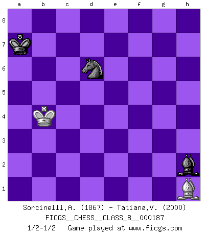 Last move : 1/2-1/2 2013 June 27 20:12:25 [Event "FICGS__CHESS__CLASS_B__000187"] [Site "FICGS"] [Date "2013.04.04"] [Round "1"] [White "Sorcinelli,Andrea"] [Black "Tatiana,Vanessa"] [Result "1/2-1/2"] [WhiteElo "1867"] [BlackElo "2000"] 1.e4 c5 2.Nf3 d6 3.d4 cxd4 4.Nxd4 Nf6 5.Nc3 a6 6.f3 e5 7.Nb3 Be7 8.Be3 Be6 9.Qd2 Nbd7 10.g4 h6 11.O-O-O b5 12.h4 Nb6 13.Qf2 Nfd7 14.Na5 Qc7 15.Kb1 Na4 16.Nxa4 bxa4 17.Bd2 Rb8 18.a3 d5 19.exd5 Bxd5 20.Bb4 Nf6 21.c3 Nxg4 22.Qg3 Ne3 23.Qxg7 Bxb4 24.Rxd5 Nxd5 25.Qxh8+ Bf8 26.Nc6 Nxc3+ 27.Ka1 Rb6 28.Qxe5+ Qxe5 29.Nxe5 Nd1 30.Nc4 Rb3 31.Bg2 Nf2 32.Re1+ Be7 33.Na5 Rb6 34.Nc4 Rg6 35.Bf1 Kf8 36.Ne5 Rg1 37.h5 Rh1 38.Ka2 Kg7 39.Nd7 Bd6 40.Nb6 a5 41.Nxa4 Rxh5 42.Ba6 Rg5 43.Rf1 Rg2 44.Nb6 h5 45.Nd5 Be5 46.Ne3 Rh2 47.Kb3 Nh3 48.Nc4 Bc7 49.Rd1 h4 50.Bc8 Ng5 51.Rd5 Nxf3 52.Ka4 Kg6 53.Rc5 Bd8 54.Rd5 Bf6 55.Kxa5 Nd4 56.Ka4 Rc2 57.Rc5 Kg7 58.b4 Be7 59.Rc7 Bd8 60.Rd7 Bf6 61.Rc7 Be5 62.Rc5 Bf4 63.Na5 Rxc5 64.bxc5 Ne6 65.Kb5 h3 66.Bb7 Kf8 67.Bh1 Ke7 68.a4 Kd7 69.Nc4 Bh2 70.a5 Bg1 71.Ne5+ Kc7 72.Nxf7 Nxc5 73.Ng5 h2 74.Nf3 Ne4 75.Nxh2 Nd6+ 76.Kb4 Bxh2 77.a6 Kb6 78.a7 Kxa7 1/2-1/2 Sicilian : Najdorf Queenside Castling by player White (move 11) 10 pieces endgame at move 64 : White KBNPP , Black KBNPP WHITE : King + 1 Bishop 1 Knight 2 Pawns BLACK : King + 1 Bishop 1 Knight 2 Pawns 9 pieces endgame at move 72 : White KBNPP , Black KBNP WHITE : King + 1 Bishop 1 Knight 2 Pawns BLACK : King + 1 Bishop 1 Knight 1 Pawn 8 pieces endgame at move 72 : White KBNP , Black KBNP WHITE : King + 1 Bishop 1 Knight 1 Pawn BLACK : King + 1 Bishop 1 Knight 1 Pawn 7 pieces endgame at move 75 : White KBNP , Black KBN WHITE : King + 1 Bishop 1 Knight 1 Pawn BLACK : King + 1 Bishop 1 Knight 6 pieces endgame at move 76 : White KBP , Black KBN WHITE : King + 1 Bishop 1 Pawn BLACK : King + 1 Bishop 1 Knight 5 pieces endgame at move 78 : White KB , Black KBN WHITE : King + 1 Bishop BLACK : King + 1 Bishop 1 Knight This chess game ended in a draw. Follow this game move after move (download)When your house is on fire, you can't be bothered with the neighbors. Or, as we say in Chess, if your King is under attack you don't worry about losing a Pawn on the Queen's side. (Gary Kasparov) Kritik überlasse ich den Spießern. Ich zeige nichts, wofür ich mich schämen muss. (Alexandra Kosteniuk) El pensamiento metódico es mas útil en el Ajedrez que la inspiración. (C. J. S. Purdy) À la honte des hommes, on sait que les lois du jeu sont les seules qui soient partout justes, claires, inviolables et exécutées. Pourquoi l'Indien qui a donné les règles du jeu d'échecs est-il obéi de bon gré dans toute la terre, et que les décrétales des papes, par exemple, sont aujourd'hui un objet d'horreur et de mépris ? C'est que l'inventeur des échecs combina tout avec justesse pour la satisfaction des joueurs, et que les papes, dans leurs décrétales, n'eurent en vue que leur seul avantage. L'Indien voulut exercer également l'esprit des hommes et leur donner du plaisir; les papes ont voulu abrutir l'esprit des hommes. Voltaire (Dictionnaire philosophique / Garnier 1967) All the biggest technological inventions created by man - the airplane, the automobile, the computer - says little about his intelligence, but speaks volumes about his laziness. (Mark Kennedy)