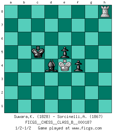 Last move : 1/2-1/2 2014 February 21 16:26:49 [Event "FICGS__CHESS__CLASS_B__000187"] [Site "FICGS"] [Date "2013.04.04"] [Round "1"] [White "Suwara,Kazimierz"] [Black "Sorcinelli,Andrea"] [Result "1/2-1/2"] [WhiteElo "1828"] [BlackElo "1867"] 1.e4 e5 2.Nf3 Nc6 3.Bb5 a6 4.Ba4 Nf6 5.O-O Be7 6.Qe2 b5 7.Bb3 O-O 8.c3 d6 9.Rd1 Na5 10.Bc2 c5 11.d4 Qc7 12.d5 Bd7 13.b3 h6 14.Nbd2 c4 15.b4 Nb7 16.a4 a5 17.axb5 Bxb5 18.Nb1 Bd7 19.h3 axb4 20.Rxa8 Rxa8 21.cxb4 Bd8 22.Be3 c3 23.Bd3 Ra4 24.Rc1 Rxb4 25.Nxc3 Qb8 26.Na2 Rb3 27.Bc4 Ra3 28.Qb2 Rxe3 29.fxe3 Qa7 30.Kh1 Nxe4 31.Nc3 Nf6 32.Ra1 Na5 33.e4 Qe3 34.Bf1 Kh7 35.Re1 Qc5 36.Rb1 Qe3 37.Qd2 Qc5 38.Qc1 Qc7 39.Ba6 Qc5 40.Bb5 Bxb5 41.Rxb5 Qc7 42.Qc2 Nb7 43.Kh2 Nc5 44.Rb2 Qe7 45.Ra2 Bb6 46.Na4 Nxa4 47.Rxa4 Bc5 48.g3 g6 49.Kg2 Kg7 50.Qb1 Qc7 51.Qb5 Qc8 52.Nd2 Nh7 53.Qa6 Qb8 54.Qc4 h5 55.Qb3 Qc8 56.Nf3 f5 57.exf5 Qxf5 58.g4 hxg4 59.hxg4 Qf7 60.Qd3 Qb7 61.g5 Qb2+ 62.Kh3 Qc1 63.Kg4 Qb2 64.Nh4 Nf8 65.Qe4 Qc1 66.Ra2 Be3 67.Nf3 Qc8+ 68.Kg3 Bf4+ 69.Kf2 Qg4 70.Ra7+ Nd7 71.Kf1 Kf7 72.Ng1 Ke7 73.Qf3 Qxg5 74.Qh3 Qf5 75.Qxf5 gxf5 76.Ne2 Be3 77.Rb7 Kd8 78.Ng3 f4 79.Ne4 Nc5 80.Nxc5 dxc5 81.d6 c4 82.Rc7 Bb6 83.Rxc4 Kd7 84.Ke2 Kxd6 85.Kf3 Bd4 86.Ke4 Be3 87.Ra4 Bd4 88.Ra8 Kc5 89.Rc8+ Kb4 90.Rc1 Kb5 91.Rc2 Kb6 92.Rc8 Kb5 93.Rc1 Kb4 94.Rb1+ Kc3 95.Ra1 Kc2 96.Ra6 Kc3 97.Rh6 Kc4 98.Rc6+ Kb4 99.Rc8 Kb3 100.Rc7 Kb4 101.Rh7 Kc5 102.Rh8 1/2-1/2 Ruy Lopez : Worrall attack, sharp line Kingside Castling by player White (move 5) Kingside Castling by player Black (move 7) 10 pieces endgame at move 75 : White KRNP , Black KBNPPP WHITE : King + 1 Rook 1 Knight 1 Pawn BLACK : King + 1 Bishop 1 Knight 3 Pawns 9 pieces endgame at move 80 : White KRNP , Black KBPPP WHITE : King + 1 Rook 1 Knight 1 Pawn BLACK : King + 1 Bishop 3 Pawns 8 pieces endgame at move 80 : White KRP , Black KBPPP WHITE : King + 1 Rook 1 Pawn BLACK : King + 1 Bishop 3 Pawns 7 pieces endgame at move 83 : White KRP , Black KBPP WHITE : King + 1 Rook 1 Pawn BLACK : King + 1 Bishop 2 Pawns 6 pieces endgame at move 84 : White KR , Black KBPP WHITE : King + 1 Rook BLACK : King + 1 Bishop 2 Pawns This chess game ended in a draw. Follow this game move after move (download)You sit at the board and suddenly your heart leaps. Your hand trembles to pick up the piece and move it. But what Chess teaches you is that you must sit there calmly and think about whether it's really a good idea and whether there are other better ideas. (Stanley Kubrick) Schach ist Krieg, im Schach geht es um testosterongesteuerte Urschreie. (Garry Kasparov) El Ajedrez es sobre todo, ¡una pelea!. (Emanuel Lasker) Ce n'est pas pour s'amuser qu'il joue aux échecs : il célèbre un culte. (Vladimir Nabokov) Wisdom doesn't necessarily come with age. Sometimes age just shows up all by itself. (Tom Watson)