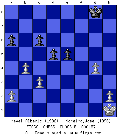 Last move : 1-0 2013 September 8 23:49:47 [Event "FICGS__CHESS__CLASS_B__000187"] [Site "FICGS"] [Date "2013.04.04"] [Round "1"] [White "Mevel,Alberic"] [Black "Moreira,Jose"] [Result "1-0"] [WhiteElo "1986"] [BlackElo "1896"] 1.e4 c5 2.Nf3 d6 3.d4 cxd4 4.Nxd4 Nf6 5.Nc3 a6 6.Bc4 e6 7.Bb3 Nbd7 8.f4 Nc5 9.O-O Nfxe4 10.Nxe4 Nxe4 11.f5 e5 12.Qh5 Qd7 13.Bg5 Nxg5 14.Qxg5 h6 15.Qh4 Qc7 16.Kh1 h5 17.f6 g6 18.Ne2 Bh6 19.Nc3 O-O 20.Nd5 Qc5 21.Ne7+ Kh8 22.c3 Bd7 23.Rae1 Qc7 24.Qg3 Bc6 25.Bxf7 Rxf7 26.Qxg6 Rh7 27.Rf5 Qd8 28.Rxh5 Qf8 29.Nxc6 bxc6 30.Re3 Qe8 31.Rxh6 Qxg6 32.Rxg6 Rg8 33.f7 Rxf7 34.Rh3+ Rh7 35.Rxh7+ Kxh7 36.Rxg8 Kxg8 37.b4 d5 38.g4 1-0 Sicilian : Najdorf, Lipnitzky attack Kingside Castling by player White (move 9) Kingside Castling by player Black (move 19) Player White won this chess game. Follow this game move after move (download)Pawn endings are to Chess what putting is to golf. (Cecil Purdy) Ich weiss nicht was Gott gegen mich auf 1.e4 antworten würde. (Robert James Fischer) Debió haber existido una vez en que los hombres eran semidióses, de otra manera no hubiesen podido inventar el Ajedrez. (Gustav Schenk) Si le désir cupide (et stupide) de gagner est une inépuisable source de souffrance, une combinaison brillante sur l'échiquier est une découverte : le coquelicot qui s'épanouit lorsque apparaît la Voie Lactée. (Arrabal) Industry executives and analysts often mistakenly talk about strategy as if it were some kind of chess match. But in chess, you have just two opponents, each with identical resources, and with luck playing a minimal role. The real world is much more like a poker game, with multiple players trying to make the best of whatever hand fortune has dealt them. In our industry, Bill Gates owns the table until someone proves otherwise. (David Moschella, 'Computerworld')