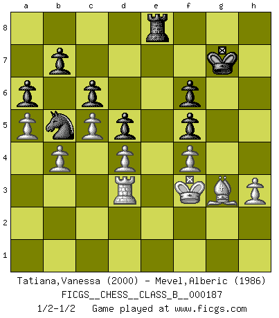 Last move : 1/2-1/2 2013 November 18 23:53:24 [Event "FICGS__CHESS__CLASS_B__000187"] [Site "FICGS"] [Date "2013.04.04"] [Round "1"] [White "Tatiana,Vanessa"] [Black "Mevel,Alberic"] [Result "1/2-1/2"] [WhiteElo "2000"] [BlackElo "1986"] 1.e4 d5 2.exd5 Nf6 3.d4 Bg4 4.Bb5+ Nbd7 5.Be2 Bxe2 6.Nxe2 Nxd5 7.O-O e6 8.c4 N5f6 9.Nbc3 Bd6 10.c5 Be7 11.Bf4 O-O 12.a3 Nh5 13.Be3 c6 14.Nc1 Nhf6 15.Nd3 Nd5 16.Nxd5 exd5 17.Qb3 Qc8 18.Bf4 Re8 19.Rfe1 Nf8 20.Be5 Ng6 21.Rad1 Nh4 22.Bf4 Nf5 23.Ne5 Bf6 24.g4 Nh4 25.h3 h5 26.Qg3 hxg4 27.Nxg4 Ng6 28.Rxe8+ Qxe8 29.Nxf6+ gxf6 30.Be3 Kg7 31.Kh2 Qd7 32.Rg1 Rh8 33.a4 Qf5 34.b4 a6 35.a5 Rh5 36.Rg2 Kh7 37.Qg4 Qxg4 38.Rxg4 Kg7 39.Rg1 f5 40.f3 f6 41.Kg3 Rh8 42.Rh1 Nf8 43.f4 Ne6 44.Re1 Kf7 45.Rh1 Nc7 46.Kf3 Nb5 47.Rh2 Kg7 48.Bf2 Kg6 49.Rg2+ Kf7 50.Rh2 Re8 51.Be3 Re4 52.Rd2 Kg7 53.Bf2 Kg6 54.Rd3 Re8 55.Bg3 Kg7 1/2-1/2 Scandinavian defense Kingside Castling by player White (move 7) Kingside Castling by player Black (move 11) This chess game ended in a draw. Follow this game move after move (download)The passed pawn is a criminal, who should be kept under lock and key. Mild measures, such as police surveillance, are not sufficient. (Nimzovitch) Smyslow ist ein Beweis dafür, dass ich noch zehn Jahre spielen kann! [der 75 jährige über den 85 jährigen] (Viktor Kortschnoi) Fischer sacrificó virtualmente todo lo que la mayoría de nosotros los 'debiles' (término que él usa) valoramos, respetamos y apreciamos por el amor de un astuto, a menudo hermoso tablero de juego, por el privilegio ambivalente de ser su mas grande maestro. (Paul Kollar) Shah mat. Le roi est mort. Cri de fierté d'un joueur venant de terrasser son adversaire, courtoisement, sans effusion de sang. Real knowledge is to know the extent of one's ignorance. (Confucius)