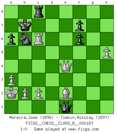 Last move : 1-0 2013 July 4 14:46:2 [Event "FICGS__CHESS__CLASS_B__000187"] [Site "FICGS"] [Date "2013.04.04"] [Round "1"] [White "Moreira,Jose"] [Black "Timkin,Nikolay"] [Result "1-0"] [WhiteElo "1896"] [BlackElo "1897"] 1.e4 c5 2.Nf3 Nc6 3.d4 cxd4 4.Nxd4 Nf6 5.Nc3 d6 6.Bg5 e6 7.Qd2 Be7 8.Ndb5 a6 9.Bxf6 gxf6 10.Nd4 Bd7 11.Nb3 Rg8 12.O-O-O Qb6 13.Kb1 O-O-O 14.f4 h5 15.g3 h4 16.gxh4 Rh8 17.Qe1 Rdg8 18.Be2 Qe3 19.Rf1 Qh3 20.h5 Qxh2 21.Na4 Kc7 22.Qd2 Rg3 23.a3 Qg2 24.Nc3 Kb8 25.f5 Ne5 26.Na5 Bd8 27.Nxb7 Kxb7 28.Qxd6 Bc6 29.Qb4+ Bb6 30.Rd2 Qh3 31.fxe6 Qxe6 32.Nd5 Nd7 33.Nxb6 Nxb6 34.Rd6 Qxe4 35.Qc5 Rg5 36.Qc3 Rc8 37.Re1 Na4 38.Qd2 Qh4 39.Rxc6 Rd5 40.Qxd5 Qxe1+ 41.Ka2 Nb6 42.Qe4 1-0 Sicilian defense Queenside Castling by player White (move 12) Queenside Castling by player Black (move 13) Player White won this chess game. Follow this game move after move (download)You know, comrade Pachman, I don't enjoy being a Minister, I would rather play Chess like you. (Che Guevara) Nach Morphy wurde nichts neues mehr in der Behandlung offener Positionen gefunden. (Mikhail Moiseyevich Botvinik) Aún el Rey más flojo huye despavorido ante la amenaza de un Jaque doble. (Aaron Nimzowitsch) Que feriez-vous si vous étiez en train de jouer aux échecs et que la fin du monde arrive ? Je continuerais à jouer. (Saint Borromée) Follow your passion, and success will follow you. (Arthur Buddhold)