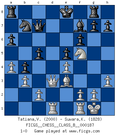 Last move : 1-0 2013 July 19 3:29:56 [Event "FICGS__CHESS__CLASS_B__000187"] [Site "FICGS"] [Date "2013.04.04"] [Round "1"] [White "Tatiana,Vanessa"] [Black "Suwara,Kazimierz"] [Result "1-0"] [WhiteElo "2000"] [BlackElo "1828"] 1.e4 e5 2.Nf3 Nc6 3.Bb5 a6 4.Ba4 b5 5.Bb3 Na5 6.O-O d6 7.d4 f6 8.Bxg8 Rxg8 9.Nc3 Bg4 10.Qd3 Be7 11.h3 Bh5 12.Nd5 c6 13.Nxe7 Qxe7 14.Nh4 Qc7 15.a4 Nb7 16.Be3 Bf7 17.b3 b4 18.Nf5 c5 19.dxc5 dxc5 20.Rad1 1-0 This chess game has been lost on time (started : 2013.04.04 18:47:23) Ruy Lopez : Taimanov (chase/wing/Accelerated counterthrust) variation Kingside Castling by player White (move 6) Player White won this chess game. Follow this game move after move (download)Chess is a terrific way for kids to build self image and self esteem. (Saudin Robovic) Ohne Leiden bildet sich kein Charakter. (Ernst Freiherr von Feuchtersleben) Nunca antes ha habido un jugador de Ajedrez con tal conocimiento a fondo de las complejidades del juego y una inmensa voluntad absolutamente indomable de ganar. Yo pienso que Fischer es el jugador mas grande que jamás haya existido. (Lisa Lane) Aux échecs, les retours au sommet sont rares : les dommages psychologiques consécutifs à une défaite sont trop sévères. (Daily Telegraph) Cactus - It is depressed cucumber. (Ilmars Cirulis)
