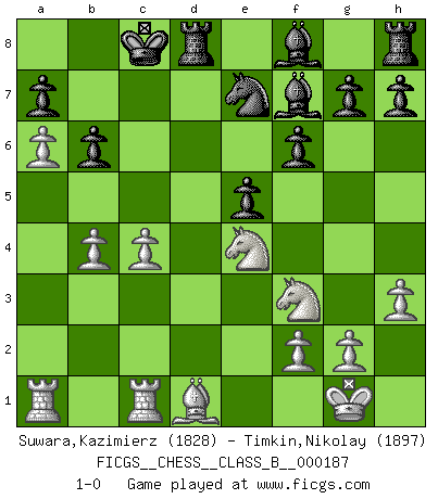 Last move : 1-0 2013 September 25 14:58:0 [Event "FICGS__CHESS__CLASS_B__000187"] [Site "FICGS"] [Date "2013.04.04"] [Round "1"] [White "Suwara,Kazimierz"] [Black "Timkin,Nikolay"] [Result "1-0"] [WhiteElo "1828"] [BlackElo "1897"] 1.e4 c5 2.c3 Nf6 3.e5 Nd5 4.Nf3 Nc6 5.Bc4 Nb6 6.Bb3 d5 7.exd6 Qxd6 8.a4 c4 9.Bc2 Bg4 10.a5 Nd7 11.d4 cxd3 12.Qxd3 Qxd3 13.Bxd3 Nc5 14.Bc2 e5 15.Nbd2 O-O-O 16.h3 Bh5 17.O-O Nd3 18.b4 f6 19.Ne4 Nxc1 20.Rfxc1 Ne7 21.Bd1 Bf7 22.a6 b6 23.c4 1-0 Sicilian : Alapin's variation (2.c3) Queenside Castling by player Black (move 15) Kingside Castling by player White (move 17) Player White won this chess game. Follow this game move after move (download)Chess demands total concentration. (Bobby Fischer) Offener Brief an US-Präsident Bush anlässlich der Verhaftung Bobby Fishers: Verhaften Sie mich. Stecken Sie mich in dieselbe Zelle wie Bobby Fisher und geben Sie uns ein Schachspiel mit. (Boris Vassilievich Spassky) ¿Esta Bobby Fischer algo cuerdo?. (Salo Flohr) Karpov est une pièce de musée. (Garry Kasparov) Life is like internet, nothing interesting, but noone want to leave it. (Ilmars Cirulis)