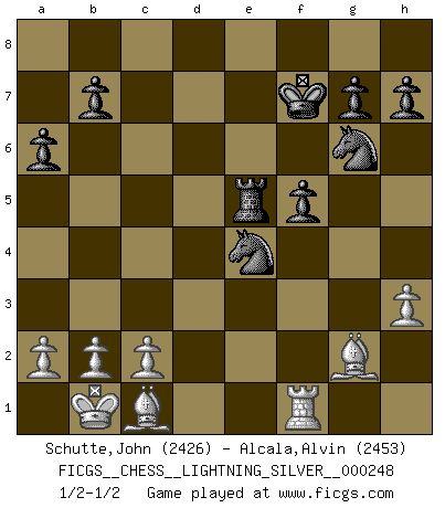Last move : 1/2-1/2 2013 April 4 19:46:6 [Event "FICGS__CHESS__LIGHTNING_SILVER__000248"] [Site "FICGS"] [Date "2013.04.04"] [Round "1"] [White "Schutte,John"] [Black "Alcala,Alvin"] [Result "1/2-1/2"] [WhiteElo "2426"] [BlackElo "2453"] 1.e4 c5 2.Nf3 d6 3.d4 cxd4 4.Nxd4 Nf6 5.Nc3 a6 6.Be3 e5 7.Nb3 Be7 8.h3 Be6 9.f4 exf4 10.Bxf4 Nc6 11.Qe2 Nd7 12.O-O-O Nce5 13.Nd4 Rc8 14.Qe3 Bf6 15.Nf5 O-O 16.Kb1 Qa5 17.Nd5 Rc5 18.Be2 Rxd5 19.Rxd5 Bxd5 20.exd5 Qxd5 21.Rd1 Qxg2 22.Bf1 Qh1 23.Qe2 Qc6 24.Nxd6 Ng6 25.Bc1 Qc7 26.Ne8 Qc8 27.Nxf6+ Nxf6 28.Bg2 Re8 29.Qf2 Qc7 30.Qf3 Ne4 31.Re1 f5 32.Rf1 Re5 33.Qb3+ Qf7 34.Qxf7+ Kxf7 1/2-1/2 Sicilian : Najdorf, Byrne (English) attack Queenside Castling by player White (move 12) Kingside Castling by player Black (move 15) This chess game ended in a draw. Follow this game move after move (download)Half the variations which are calculated in a tournament game turn out to be completely superfluous. Unfortunately, no one knows in advance which half. (Jan Tinman) Wenn Du absolut nicht mehr weißt, was Du tun sollst, dann ist es Zeit für Panik. (John van der Wiel) ¿Porque tengo que perder ante este idiota?. (Aron Nimzovich) Le pion, dans sa simplicité, marche droit devant lui, mais lorsqu'il prend, il le fait obliquement? Ainsi l'homme, tant qu'il reste pauvre, marche dans la droiture et vit honnêtement, mais lorsqu'il recherche les honneurs, il flatte, se parjure et, par les voies obliques, cherche une position supérieure sur l'échiquier du monde. (Jean de Galles) I find your interest interesting. (Gregory House, House M.D.)
