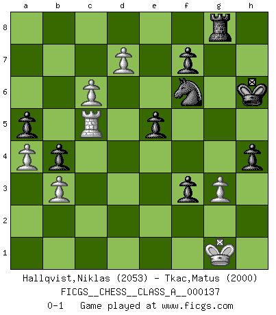 Last move : 0-1 2014 April 30 8:42:17 [Event "FICGS__CHESS__CLASS_A__000137"] [Site "FICGS"] [Date "2013.04.05"] [Round "1"] [White "Hallqvist,Niklas"] [Black "Tkac,Matus"] [Result "0-1"] [WhiteElo "2053"] [BlackElo "2000"] 1.d4 Nf6 2.g3 c5 3.d5 b5 4.Bg2 d6 5.a4 b4 6.c4 a5 7.b3 Ra7 8.Bb2 g6 9.Nh3 Bg7 10.Nf4 h5 11.h4 O-O 12.O-O Nbd7 13.Nd2 Re8 14.Qc2 Ne5 15.Rfe1 Bh6 16.Rad1 Qc7 17.Bh3 Bxh3 18.Nxh3 R7a8 19.Ng5 Qd7 20.f4 Neg4 21.e4 Nh7 22.Kg2 Nxg5 23.hxg5 Bg7 24.Bxg7 Kxg7 25.e5 dxe5 26.fxe5 Qf5 27.Qxf5 gxf5 28.Nf3 e6 29.d6 Red8 30.Re2 Rg8 31.Ne1 Kg6 32.Nd3 Rgc8 33.d7 Rd8 34.Nxc5 Ra7 35.Rd6 Rc7 36.Na6 Rcxd7 37.c5 Kxg5 38.Kh3 f4 39.Nb8 Rxd6 40.exd6 Rxb8 41.c6 f3 42.Rc2 Nf6 43.Rc5+ Kh6 44.Kh2 Rg8 45.d7 e5 46.Kg1 h4 0-1 This chess game has been lost on time (started : 2013.04.05 1:11:48) Queen's pawn game Kingside Castling by player Black (move 11) Kingside Castling by player White (move 12) Player Black won this chess game. Follow this game move after move (download)Checkers is for tramps. (Paul Morphy) Wenn Capablanka heute auf der Schachbühne erscheinen würde, hätte er ein halbes Jahr gebraucht um sich die Schachtheorie anzueignen. Und dann hätte er alles und jeden besiegt. (Mikhail Moiseyevich Botvinik) La vida es como un juego de Ajedrez, cambiando con cada movimiento. (Proverbio Chino) Un footballeur joue avec ses pieds, parfois avec sa tête. Un joueur d'échecs ne joue qu'avec sa tête. Et quand il ne joue plus, il meurt. (Jacob Murray) Ah, beer! The cause of, and the solution to, all of life's problems. (Homer Simpson)