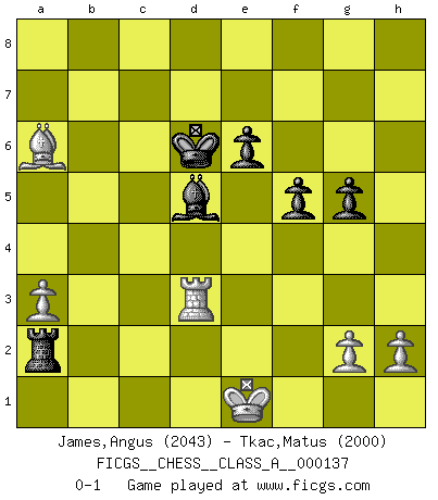 Last move : 0-1 2014 June 1 21:16:53 [Event "FICGS__CHESS__CLASS_A__000137"] [Site "FICGS"] [Date "2013.04.05"] [Round "1"] [White "James,Angus"] [Black "Tkac,Matus"] [Result "0-1"] [WhiteElo "2043"] [BlackElo "2000"] 1.e4 c5 2.Nf3 Qc7 3.Nc3 Nc6 4.d4 cxd4 5.Nxd4 e6 6.f4 Nxd4 7.Qxd4 a6 8.Be3 b5 9.Be2 Bb7 10.O-O Rc8 11.a3 Nf6 12.e5 Nd5 13.Nxd5 Bxd5 14.a4 bxa4 15.Bd3 a3 16.c4 Ba8 17.Rf2 Be7 18.bxa3 Bc5 19.Qxc5 Qxc5 20.Bxc5 Rxc5 21.Rb2 Ke7 22.Re1 h6 23.Rb6 Ra5 24.Rb3 g5 25.fxg5 hxg5 26.Bf1 Rh4 27.Bd3 Bc6 28.Re3 Rf4 29.Re2 Rd4 30.Re3 d6 31.exd6+ Kxd6 32.Rg3 Re5 33.Bf1 Re1 34.Kf2 Ra1 35.c5+ Kxc5 36.Bxa6 Rf4+ 37.Ke3 Re4+ 38.Kd3 f5 39.Rc3+ Kd6 40.Kd2 Rd4+ 41.Rcd3 Ra2+ 42.Ke1 Rxd3 43.Rxd3+ Bd5 0-1 Sicilian : Quinteros variation Kingside Castling by player White (move 10) Player Black won this chess game. Follow this game move after move (download)The hallmark of the artist is simplicity. (Larry Evans) Man kann eine Schachpartie nur gewinnen, wenn das Gleichgewicht gestört ist. In einer Stellung mit ungestörtem Gleichgewicht ist auch das größte Genie hilflos - in der Stellung steckt dann eben kein genialer Einfall. (Wilhelm Steinitz) La batalla por la última verdad nunca sera ganada. Y es por eso que el Ajedrez es tan fascinante. (Hans Kmoch) La vie est comme un jeu d'échecs : nous esquissons un plan, mais celui-ci est tributaire de ce que daignent faire l'adversaire aux échecs et le destin dans la vie. (Arthur Schopenhauer) I just play for fun. (Anna Kournikova)