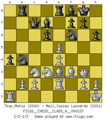 Last move : 1/2-1/2 2013 August 11 19:1:23 [Event "FICGS__CHESS__CLASS_A__000137"] [Site "FICGS"] [Date "2013.04.05"] [Round "1"] [White "Tkac,Matus"] [Black "Meli,Cosimo Leonardo"] [Result "1/2-1/2"] [WhiteElo "2000"] [BlackElo "2001"] 1.e4 c5 2.Nf3 d6 3.d4 Nf6 4.Nc3 cxd4 5.Nxd4 Nc6 6.Bg5 Bd7 7.a3 a6 8.Nb3 e6 9.Be2 h6 10.Be3 Be7 11.f4 O-O 12.O-O Qc7 13.Qd3 b5 14.Qd2 b4 15.axb4 Nxb4 16.Bf3 e5 17.Nc1 Rab8 18.Nd3 Rfe8 19.Qf2 a5 20.Kh1 Bf8 21.Rfe1 Qb7 22.Re2 a4 23.Qg3 Qc7 24.fxe5 1/2-1/2 Sicilian Kingside Castling by player Black (move 11) Kingside Castling by player White (move 12) This chess game ended in a draw. Follow this game move after move (download)I like to say that Bobby Fischer was the greatest player ever. But what made Fischer a genius was his ability to blend an American freshness and pragmatism with Russian ideas about strategy. (Bruce Pandolfini) Vom Schach wurde gesagt das Leben sei dafür nicht lange genug. Aber das ist der Fehler des Lebens, nicht des Schach'. (Irving Chernev) Los Peones son nacidos libres, y aún así, se encuentran encadenados por todos lados. (Rick Kennedy) Il s'avisa de me proposer d'apprendre les échecs qu'il jouait un peu... me voilà forcené des échecs. J'achète un échiquier, je m'enferme dans ma chambre, j'y passe des jours et des nuits à vouloir apprendre par cur toutes les parties. (Jean-Jacques Rousseau, Confessions) A government big enough to give you everything you want is strong enough to take everything you have. (Thomas Jefferson)