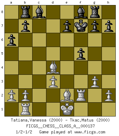 Last move : 1/2-1/2 2013 August 9 12:23:44 [Event "FICGS__CHESS__CLASS_A__000137"] [Site "FICGS"] [Date "2013.04.05"] [Round "1"] [White "Tatiana,Vanessa"] [Black "Tkac,Matus"] [Result "1/2-1/2"] [WhiteElo "2000"] [BlackElo "2000"] 1.e4 c5 2.Nf3 Qc7 3.c3 Nf6 4.e5 Nd5 5.c4 Nb4 6.Nc3 N4c6 7.Nb5 Qa5 8.Be2 a6 9.Nc3 Nd4 10.Qa4 Qd8 11.Nxd4 cxd4 12.Ne4 Nc6 13.f4 d3 14.Bxd3 d6 15.exd6 f5 16.Nc3 Qxd6 17.Be2 Qxf4 18.Nd5 Qh4+ 19.g3 Qe4 20.Rf1 Kf7 21.d3 Qe5 22.Nb6 Rb8 23.Rb1 Nd4 24.Rf2 Qd6 25.c5 Qxc5 26.Be3 Qxb6 27.Qxd4 Qxd4 28.Bxd4 Rg8 1/2-1/2 Sicilian : Quinteros variation This chess game ended in a draw. Follow this game move after move (download)It was clear to me that the vulnerable point of the American Grandmaster (Bobby Fischer) was in double-edged, hanging, irrational positions, where he often failed to find a win even in a won position. (Efim Geller) Kritik überlasse ich den Spießern. Ich zeige nichts, wofür ich mich schämen muss. (Alexandra Kosteniuk) Cuando tengas duda... ¡juega al Ajedrez!. (Tevis) Aux échecs, les retours au sommet sont rares : les dommages psychologiques consécutifs à une défaite sont trop sévères. (Daily Telegraph) Vladimir Ras-Putin is still alive... He is also a good actor, I saw him in the Lord of the Rings. (Rodolfo d'Ettorre)