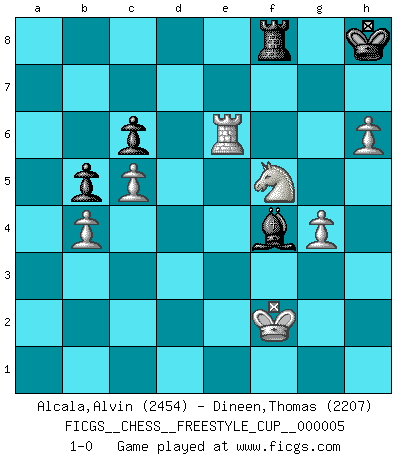 Last move : 1-0 2013 April 6 15:13:31 [Event "FICGS__CHESS__FREESTYLE_CUP__000005"] [Site "FICGS"] [Date "2013.04.06"] [Round "1"] [White "Alcala,Alvin"] [Black "Dineen,Thomas"] [Result "1-0"] [WhiteElo "2454"] [BlackElo "2207"] 1.c4 e5 2.Nc3 Nf6 3.g3 Bc5 4.Bg2 O-O 5.e3 Nc6 6.Nge2 d6 7.d3 Re8 8.a3 Bg4 9.h3 Bd7 10.b4 Bb6 11.Bb2 a6 12.Rc1 Ba7 13.O-O Ne7 14.d4 c6 15.dxe5 dxe5 16.Qc2 Qc8 17.Kh2 Ng6 18.Na4 Qc7 19.c5 Rad8 20.Rcd1 Bc8 21.Ba1 Qe7 22.Nb2 Bb8 23.Nc4 Be6 24.e4 h5 25.Ng1 h4 26.Nf3 Nh5 27.Bb2 Bc7 28.Rfe1 Bxc4 29.Qxc4 a5 30.Bc3 axb4 31.axb4 Ra8 32.Rd2 b5 33.Qb3 Nf6 34.Bb2 Ra7 35.Bf1 hxg3+ 36.fxg3 Nf8 37.Bd3 Rd8 38.Red1 N6h7 39.Rf2 Ne6 40.Rdf1 f6 41.Bc2 Bb8 42.Kg2 Rad7 43.h4 Qe8 44.Rh1 Kh8 45.h5 Qg8 46.Nh4 Qe8 47.Bc1 Rd4 48.Bb1 Rc4 49.Ba2 Nhg5 50.h6 g6 51.Qb1 Rxc1 52.Qxc1 Nxe4 53.Bb1 Nxf2 54.Nxg6+ Kh7 55.Nxe5 Kh8 56.Ng6+ Kh7 57.Kxf2 f5 58.Nh4 Nd4 59.Re1 Qf7 60.Qg5 Rg8 61.Bxf5+ Qxf5+ 62.Qxf5+ Nxf5 63.Nxf5 Rf8 64.g4 Bf4 65.Re7+ Kh8 66.Re6 1-0 English : Carls' Bremen system Kingside Castling by player Black (move 4) Kingside Castling by player White (move 13) Player White won this chess game. Follow this game move after move (download)Only the player with the initiative has the right to attack. (Wilhelm Steinitz) Es gibt keine einzige Frau, der ich nicht einen Springer vorgeben könnte und trotzdem gewänne. (Robert James Fischer) El Ajedrez es una hermosa aventura. (Bent Larsen) Même un GMI sait rarement calculer sur plus de cinq coups une attaque à sacrifices. (Rudolf Spielmann) Crush them ! Make them suffer ! (General Grievous in Star Wars ep.3)