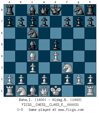 Last move : 1-0 2007 March 17 14:8:29 [Event "FICGS__CHESS__CLASS_E__000031"] [Site "FICGS"] [Date "2007.01.28"] [Round "1"] [White "Baha,Ioana-Karina"] [Black "Aldag,Benjamin"] [Result "1-0"] [WhiteElo "1400"] [BlackElo "1443"] 1.e4 e5 2.Nf3 Nc6 3.Bc4 Bc5 4.c3 1-0 This chess game has been lost on time (started : 2007.01.28 15:4:48) Giuoco Piano Player White won this chess game. Follow this game move after move (download)One doesn't have to play well, it's enough to play better than your opponent. (Siegbert Tarrasch) Ein Gewinn durch eine ungenaue Kombination, sei sie auch noch so vorzeigbar, erfüllt mich mit Schaudern. (Wilhelm Steinitz) Solo los afeminados hacen el Enroque. (Rob Sillars) Celui qui prend des risques peut perdre, celui qui n'en prend pas perd toujours. (Xavier Tartacover) It's not the will to win, but the will to prepare to win that makes the difference. (Bear Bryant)