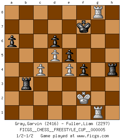 Last move : 1/2-1/2 2013 April 6 15:18:31 [Event "FICGS__CHESS__FREESTYLE_CUP__000005"] [Site "FICGS"] [Date "2013.04.06"] [Round "1"] [White "Gray,Garvin"] [Black "Fuller,Liam"] [Result "1/2-1/2"] [WhiteElo "2416"] [BlackElo "2297"] 1.e4 c5 2.Nf3 d6 3.d4 cxd4 4.Nxd4 Nf6 5.Nc3 a6 6.Be3 e5 7.Nb3 Be6 8.f3 h5 9.Qd2 Nbd7 10.Nd5 Nxd5 11.exd5 Bf5 12.Na5 Rb8 13.Be2 Qh4+ 14.Bf2 Qf6 15.O-O Be7 16.Bd3 O-O 17.a4 Qg6 18.Bxf5 Qxf5 19.Nc4 Rbc8 20.b3 Qg6 21.a5 Bg5 22.Qd3 f5 23.Rae1 h4 24.Kh1 Rcd8 25.Be3 Bxe3 26.Qxe3 f4 27.Qe4 Qh6 28.Rf2 Nf6 29.Qd3 h3 30.Kg1 Qh4 31.Nd2 hxg2 32.Ne4 Rd7 33.c4 Nxe4 34.Qxe4 Qh7 35.Rxg2 Qxe4 36.fxe4 Kf7 37.h4 Rh8 38.Rg4 b6 39.axb6 Rb7 40.Kf2 Rxb6 41.Reg1 Rxb3 42.Rxg7+ Kf8 43.R7g6 Rxh4 44.Rg8+ Kf7 1/2-1/2 Sicilian : Najdorf, Byrne (English) attack Kingside Castling by player White (move 15) Kingside Castling by player Black (move 16) This chess game ended in a draw. Follow this game move after move (download)Winning isn't everything... but losing is nothing. (Mednis) Herr Iljumschinow ist ein etwas merkwürdiger Geschäftsmann: Er arbeitet zusammen mit Leuten wie Muammar al-Gaddafi; früher ist das Saddam Hussein gewesen. (Joel Lautier) El Jaque al descubierto es el bombardero del tablero. (Reuben Fine) Psychologiquement, tu dois avoir confiance en toi même, mais cette confiance doit être basée sur des faits. (Robert Fischer) I don't know, I don't care, and it doesn't make any difference. (Albert Einstein)