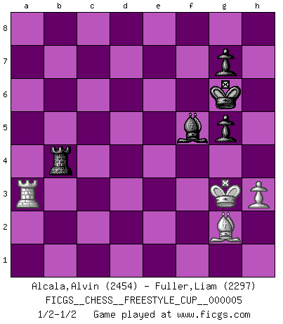 Last move : 1/2-1/2 2013 April 6 18:36:38 [Event "FICGS__CHESS__FREESTYLE_CUP__000005"] [Site "FICGS"] [Date "2013.04.06"] [Round "1"] [White "Alcala,Alvin"] [Black "Fuller,Liam"] [Result "1/2-1/2"] [WhiteElo "2454"] [BlackElo "2297"] 1.c4 e5 2.Nc3 Nf6 3.g3 Bb4 4.Nf3 e4 5.Nd4 Nc6 6.Nc2 Bxc3 7.dxc3 Ne5 8.Ne3 d6 9.Bg2 O-O 10.Qc2 Be6 11.b3 a5 12.Rb1 Qc8 13.h3 Re8 14.a4 h5 15.Ba3 Ng6 16.c5 h4 17.g4 d5 18.Bb2 Rd8 19.Rd1 c6 20.c4 Qc7 21.cxd5 cxd5 22.Bd4 Nh7 23.Qc3 f6 24.Rb1 Nf4 25.Bf1 Rac8 26.Rc1 Ng5 27.Ng2 Ng6 28.Ne3 Rd7 29.Qb2 Qd8 30.Rc2 Rdc7 31.Rd2 Qe7 32.Nc2 Bf7 33.Ne3 b6 34.b4 Qe8 35.Bg2 bxc5 36.bxc5 Rb8 37.Qa1 Rb4 38.O-O Ne7 39.Qd1 Qxa4 40.Nf5 Nxf5 41.Qxa4 Rxa4 42.gxf5 Be8 43.Rb1 Rb4 44.Rxb4 axb4 45.Rb2 Rb7 46.f3 exf3 47.exf3 Bd7 48.Bf2 Bxf5 49.c6 Rc7 50.Bxh4 Rxc6 51.Bxg5 fxg5 52.Rxb4 Kh7 53.Rd4 Be6 54.f4 Rc4 55.Rd3 Rxf4 56.Bxd5 Bf5 57.Re3 Kg6 58.Kh2 Kh6 59.Ra3 Rd4 60.Bg2 Kg6 61.Kg3 Rb4 1/2-1/2 English : Bremen, Smyslov system Kingside Castling by player Black (move 9) Kingside Castling by player White (move 38) 10 pieces endgame at move 55 : White KRBP , Black KRBPPP WHITE : King + 1 Rook 1 Bishop 1 Pawn BLACK : King + 1 Rook 1 Bishop 3 Pawns 9 pieces endgame at move 56 : White KRBP , Black KRBPP WHITE : King + 1 Rook 1 Bishop 1 Pawn BLACK : King + 1 Rook 1 Bishop 2 Pawns This chess game ended in a draw. Follow this game move after move (download)No one ever won a game by resigning. (Unknown) Der Schachmeister von Heute braucht Courage, einen Killerinstinkt, Ausdauer und Arroganz. (Larry Evans) Ciertamente, de todas la drogas del mundo, el Ajedrez debe ser el mas placentero permamentemente. (Assiac) Les Echecs ne sont pas pour les âmes timides. Ils requièrent un homme entier, qui ne s'arrête pas aveuglément à ce qui a été déjà établi, mais qui tente individuellement de sonder les profondeurs du jeu. (W. Steinitz) Winning isn't everything... but losing is nothing. (Mednis)