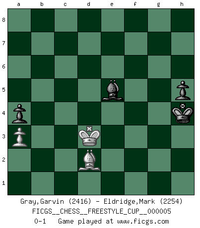 Last move : 0-1 2013 April 6 18:41:19 [Event "FICGS__CHESS__FREESTYLE_CUP__000005"] [Site "FICGS"] [Date "2013.04.06"] [Round "1"] [White "Gray,Garvin"] [Black "Eldridge,Mark"] [Result "0-1"] [WhiteElo "2416"] [BlackElo "2254"] 1.e4 c5 2.Nf3 d6 3.d4 cxd4 4.Nxd4 Nf6 5.Nc3 a6 6.Be3 e6 7.g4 e5 8.Nf5 g6 9.g5 gxf5 10.exf5 d5 11.gxf6 d4 12.Bc4 Bxf5 13.Qh5 Qxf6 14.O-O-O Nd7 15.Rxd4 exd4 16.Bg5 Qg6 17.Re1+ Ne5 18.Rxe5+ Kd7 19.Bxf7 Qxh5 20.Bxh5 dxc3 21.Rxf5 Rg8 22.Bg4 Kc6 23.Bf3+ Kd6 24.Kb1 Bg7 25.Rd5+ Ke6 26.Rd3 Kf5 27.Be3 cxb2 28.Bxb7 Rad8 29.Bd5 Rge8 30.c4 Bf6 31.h3 h5 32.Rd1 Re7 33.Bb6 R8d7 34.Be3 Re5 35.Bh6 a5 36.Be3 a4 37.a3 Re8 38.Bd2 Rb8 39.f3 Re8 40.Bc6 Red8 41.Bxd7+ Rxd7 42.c5 Rd5 43.c6 Rc5 44.Be3 Rxc6 45.Rd5+ Kg6 46.Bd2 Rc4 47.Rd3 Rd4 48.Rxd4 Bxd4 49.Bf4 Bh8 50.Be3 Bf6 51.Bd2 Kf5 52.Kc2 Bg5 53.Be1 Bf4 54.Kb1 Bc1 55.Bg3 Be3 56.Kxb2 Bf4 57.Be1 Be5+ 58.Kc2 Kf4 59.Kd3 Kxf3 60.Bd2 Kg3 61.h4 Kxh4 0-1 Sicilian : Najdorf, Byrne (English) attack Queenside Castling by player White (move 14) 10 pieces endgame at move 48 : White KBPPP , Black KBPPP WHITE : King + 1 Bishop 3 Pawns BLACK : King + 1 Bishop 3 Pawns 9 pieces endgame at move 56 : White KBPPP , Black KBPP WHITE : King + 1 Bishop 3 Pawns BLACK : King + 1 Bishop 2 Pawns 8 pieces endgame at move 59 : White KBPP , Black KBPP WHITE : King + 1 Bishop 2 Pawns BLACK : King + 1 Bishop 2 Pawns 7 pieces endgame at move 61 : White KBP , Black KBPP WHITE : King + 1 Bishop 1 Pawn BLACK : King + 1 Bishop 2 Pawns Player Black won this chess game. Follow this game move after move (download)Life is like a game of Chess, changing with each move. (Chinese proverb) Heutzutage gewinnt im Turnier nicht derjenige Spieler, der weitreichende Pläne entwirft, sondern einfach jener, der Zug um Zug kämpft. (David Bronstein) El Ajedrez lo es todo: arte, ciencia y deporte. (Anatoly Karpov) Aux échecs, l'amour-propre est satisfait quand on remporte la victoire, mais il n'y a pas de honte à être battu. (Benjamin Franklin) He who fights with monsters should be careful lest he thereby become a monster. (Friedrich Nietzsche, Beyond Good and Evil)