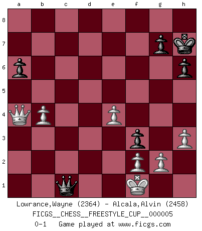 Last move : 0-1 2013 April 7 14:13:1 [Event "FICGS__CHESS__FREESTYLE_CUP__000005"] [Site "FICGS"] [Date "2013.04.07"] [Round "1"] [White "Lowrance,Wayne"] [Black "Alcala,Alvin"] [Result "0-1"] [WhiteElo "2364"] [BlackElo "2458"] 1.d4 Nf6 2.c4 c6 3.Nf3 d5 4.e3 e6 5.Nc3 Nbd7 6.Qc2 Bd6 7.Bd3 dxc4 8.Bxc4 O-O 9.O-O b5 10.Be2 a6 11.Rd1 Qc7 12.Bd2 c5 13.dxc5 Qxc5 14.b4 Qc7 15.Rac1 Bb7 16.Qb1 Qd8 17.Bd3 Qe7 18.Ne4 Nxe4 19.Bxe4 Bxe4 20.Qxe4 Nb6 21.Bc3 f5 22.Qb1 Rac8 23.a3 e5 24.e4 f4 25.Qa2+ Kh8 26.Qa1 Nc4 27.h3 Rfd8 28.Rd3 h6 29.Rcd1 Kh7 30.a4 Qe8 31.Bxe5 Bxe5 32.Nxe5 Nxe5 33.Rxd8 Rxd8 34.Rxd8 Qxd8 35.Qxe5 bxa4 36.Qa1 f3 37.Qxa4 Qg5 38.Kf1 Qc1+ 0-1 Queen's pawn game Kingside Castling by player Black (move 8) Kingside Castling by player White (move 9) Player Black won this chess game. Follow this game move after move (download)A good sacrifice is one that is not necessarily sound but leaves your opponent dazed and confused. (Rudolph Spielmann) Es gibt Leute, die glauben, alles wäre vernünftig, was man mit einem ernsthaften Gesicht tut. (Georg Christoph Lichtenberg) Si un gobernante no entiende al Ajedrez, ¿como puede governar él un reinado?. (El Rey Khusros II) Tous ces prétendus hommes politiques sont les pions, les Cavaliers, les Tours ou les Fous d'une partie d'échecs qui se jouera tant qu'un hasard ne renversera pas l'échiquier. (Honoré de Balzac) Never was anything great achieved without danger. (Niccolo Machiavelli)
