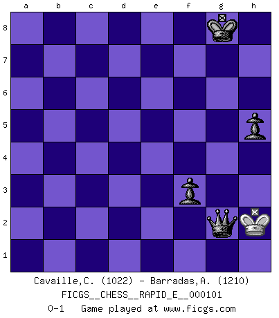 Last move : 0-1 2013 April 11 21:42:40 [Event "FICGS__CHESS__RAPID_E__000101"] [Site "FICGS"] [Date "2013.04.07"] [Round "1"] [White "Cavaille,Cedric"] [Black "Barradas,Anderson"] [Result "0-1"] [WhiteElo "1022"] [BlackElo "1210"] 1.d4 Nf6 2.c4 e6 3.Nc3 Bb4 4.Bd2 Bxc3 5.Bxc3 Ne4 6.Qc2 Nxc3 7.Qxc3 d5 8.cxd5 exd5 9.e3 O-O 10.Bd3 a6 11.Nf3 Nc6 12.Qc2 g6 13.O-O Nb4 14.Qd2 Nxd3 15.Qxd3 Bf5 16.Qd2 b6 17.b4 Qf6 18.Ne5 c5 19.bxc5 bxc5 20.Nf3 Bg4 21.dxc5 Bxf3 22.gxf3 Qxf3 23.Rac1 a5 24.Rc3 a4 25.c6 Qg4+ 26.Kh1 Qe4+ 27.f3 Qe6 28.Rc5 Rfd8 29.c7 Rd6 30.Rfc1 Rc8 31.Qb4 Rb6 32.Qxa4 Qxe3 33.Qg4 f5 34.Qg3 Rb1 35.Rxb1 Qxc5 36.Rb8 Qc1+ 37.Qg1 Qxc7 38.Rxc8+ Qxc8 39.Qd4 Qb7 40.a4 Qb1+ 41.Kg2 Qa2+ 42.Kg3 g5 43.Qxd5+ Qxd5 44.f4 Qd3+ 45.Kf2 Qd4+ 46.Kg3 Qxf4+ 47.Kg2 Qe3 48.a5 g4 49.a6 Qf3+ 50.Kg1 Qe3+ 51.Kf1 Qd3+ 52.Kg2 Qxa6 53.h3 Qe2+ 54.Kg3 h5 55.hxg4 Qxg4+ 56.Kh2 f4 57.Kh1 f3 58.Kh2 Qg2+ 0-1 Nimzo-Indian defense Kingside Castling by player Black (move 9) Kingside Castling by player White (move 13) 10 pieces endgame at move 43 : White KQPPP , Black KQPPP WHITE : King + 1 Queen 3 Pawns BLACK : King + 1 Queen 3 Pawns 9 pieces endgame at move 43 : White KPPP , Black KQPPP WHITE : King + 3 Pawns BLACK : King + 1 Queen 3 Pawns 8 pieces endgame at move 46 : White KPP , Black KQPPP WHITE : King + 2 Pawns BLACK : King + 1 Queen 3 Pawns 7 pieces endgame at move 52 : White KP , Black KQPPP WHITE : King + 1 Pawn BLACK : King + 1 Queen 3 Pawns 6 pieces endgame at move 55 : White KP , Black KQPP WHITE : King + 1 Pawn BLACK : King + 1 Queen 2 Pawns 5 pieces endgame at move 55 : White K , Black KQPP WHITE : King + BLACK : King + 1 Queen 2 Pawns Player Black won this chess game. Follow this game move after move (download)Bobby Fischer is the greatest Chess genius of all time ! (Alexander Kotov) Die Partien sind immer verschieden, die Interviews immer die gleichen. (Garry Kasparov) Me siento como si fuera una pieza en una partida de Ajedrez, cuando mi oponente me indica: esa pieza no puede ser movida. (Soren Kierkegaard) Ce qui caractérise les parties de combat, c'est que si le défenseur a constamment de difficiles problèmes à résoudre, l'attaquant doit chercher sans relâche de nouvelles possibilités d'attaque. (Koblentz) Lottery : A tax on people who are bad at math. (Author unknown)